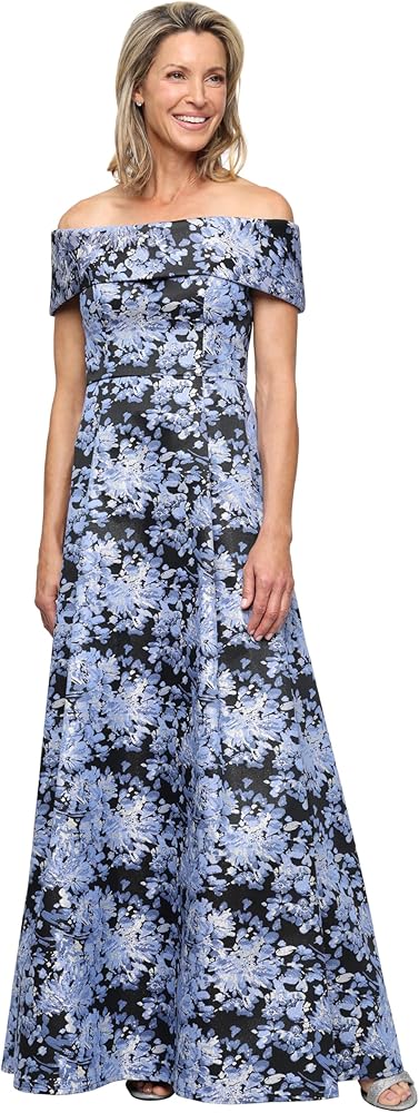 Feminine Floral: The shimmering, floral printed jacquard fabrication adds an eye-catching touch, making this off the shoulder dress a standout choice for any guest of.