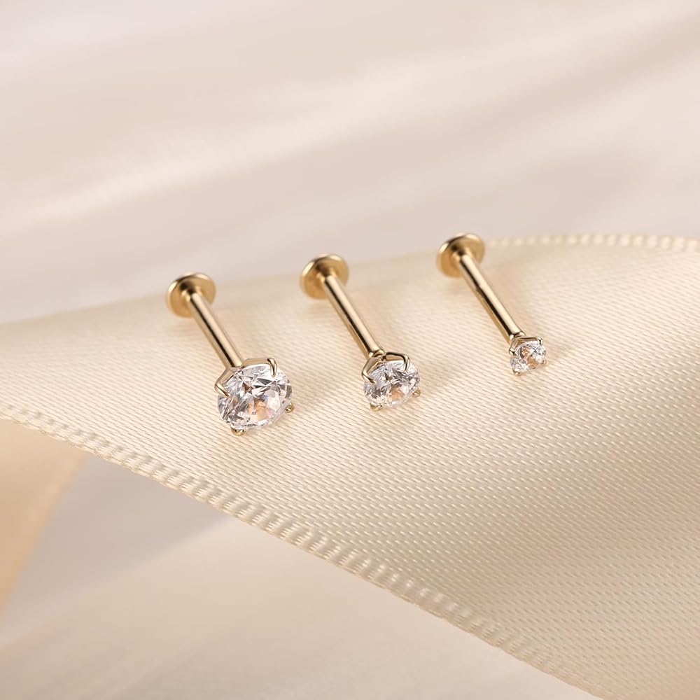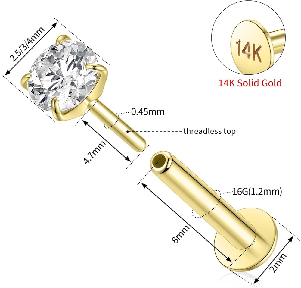 【NORMAL SIZE】Bar Thickness: 16Gauge(1.2mm); Bar Length: 5/16"=8mm; Threadless Push in Cartilage Piercing Jewelry, Easy to Screw Off and On.The bottom of the stud is stamped "14k".