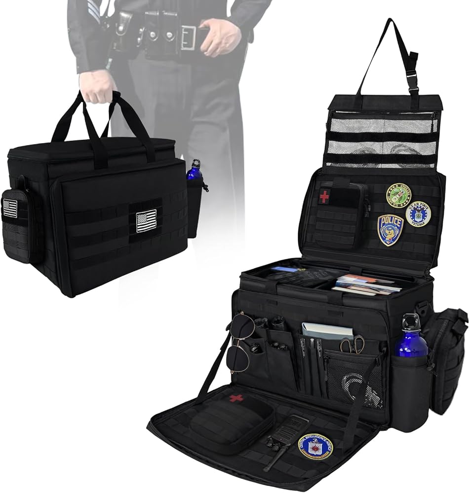 【Wide Use】For personal and professional use, ideal for police officers, road warriors, or security and law enforcement officers to carry their gear, like file folders, pens,badges, etc.A fastener strap with buckle can fix the bag top on the front seat headrest for easy access.Dimensions:21.65 x 13.38 x 3.15 inches, Large capacity:35L size