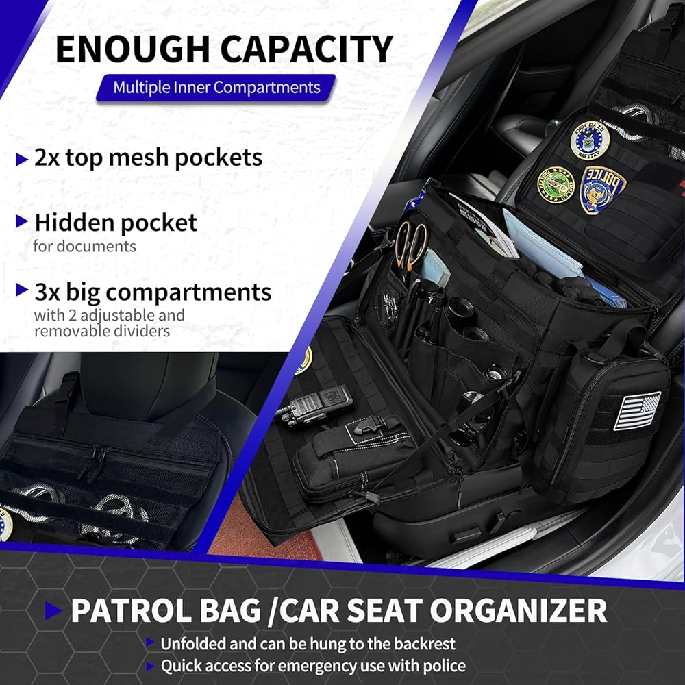 Patrol Bag Law Enforcement,Police duty bag, Police Gear Bag for Car Front Seat Organizer with Cup Holders, MOLLE System, Fits Vehicle Passenger Seat System
