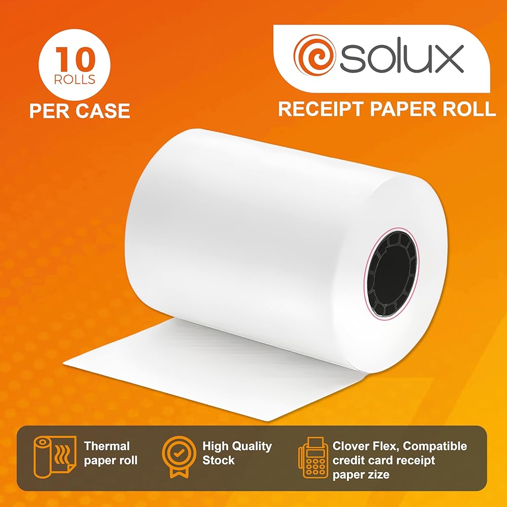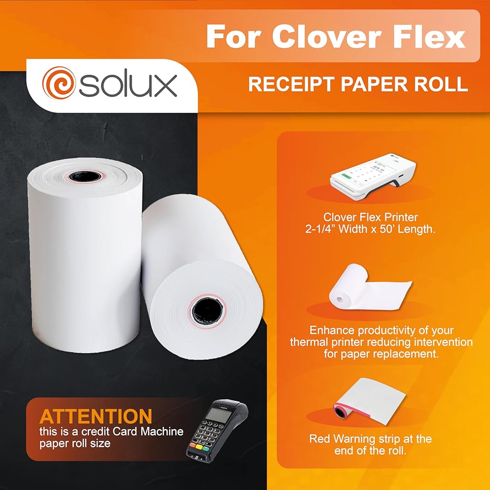 Elevate your business's transaction experience with SOLUX Thermal Paper Rolls, tailored for the dynamic Clover Flex Credit Card Machine. Engineered for excellence, our thermal paper rolls (2.25 x 50 ft) are the quintessence of quality and consistency. As your reliable partner for all point-of-sale needs, these 2 1/4" thermal paper rolls are meticulously crafted to fit seamlessly into your Clover Mini devices. Our Clover Mini Paper Rolls aren't just paper; they're a promise of uninterrupted service and crystal-clear receipts. With the SOLUX Clover Mini Receipt Paper, watch as each printout comes out with exceptional clarity, ensuring that every credit card transaction is documented with precision. Transition to a fuss-free POS system with our Clover Mini Receipt Printer Paper, designed to ease the loading process, reduce paper jams, and boost efficiency. Trust in the resilience of our Clover Paper Rolls to deliver receipts that withstand time and exposure. SOLUX's Clover Printer Paper stands out for its adaptability, compatible not just with Clover devices but also the PAX A920. This flexibility guarantees that your investment in our credit card receipt paper transcends the ordinary, providing a versatile solution across different models. Choose SOLUX, and you'll find each roll of receipt paper for Clover Flex is a symbol of our commitment to sustainability. Our receipt paper & thermal receipt paper, along with the receipt rolls, are BPA-free, fostering an environmentally conscious approach to printing. Invest in SOLUX's receipt tape and thermal receipt paper (2 1/4"), and witness the fusion of top-notch quality with ecological responsibility. The thermo receipt paper rolls are designed to provide your business with flawless performance, while also upholding an eco-friendly ethos. Welcome to a new chapter of customer satisfaction with SOLUX – where every transaction is as smooth as the paper it's printed on.