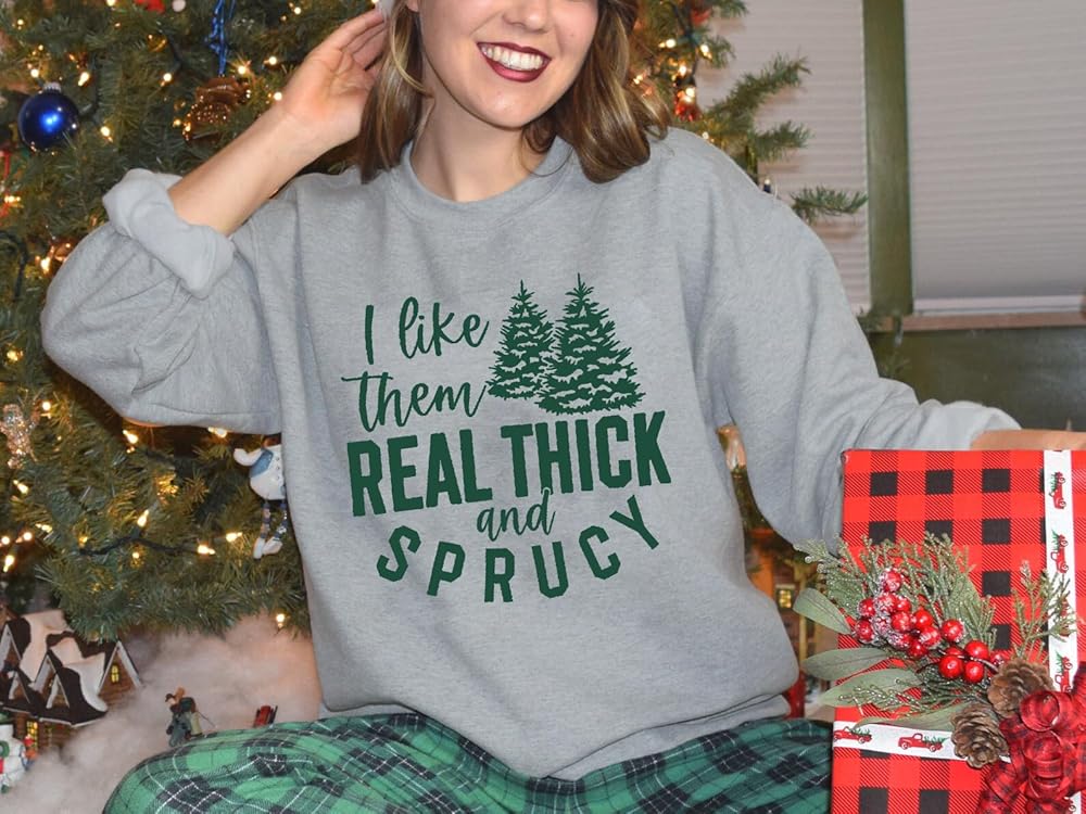 FEATURES : Funny i like them real thick and sprucey pine tree graphic, casual lightweight long sleeve sweatshirt, classical crewneck design , make it fashion and simple. Unique and funny design , and makes a great gift for christmas.