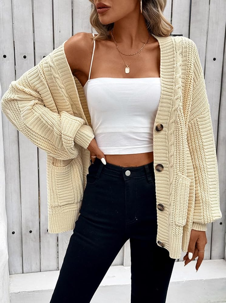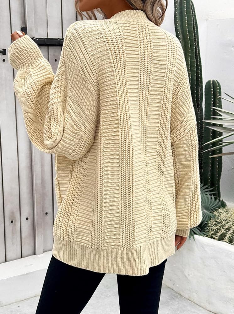 Open front cardigan for women with puff long sleeve, oversized loose style, lightweight button down knitted sweater with pockets