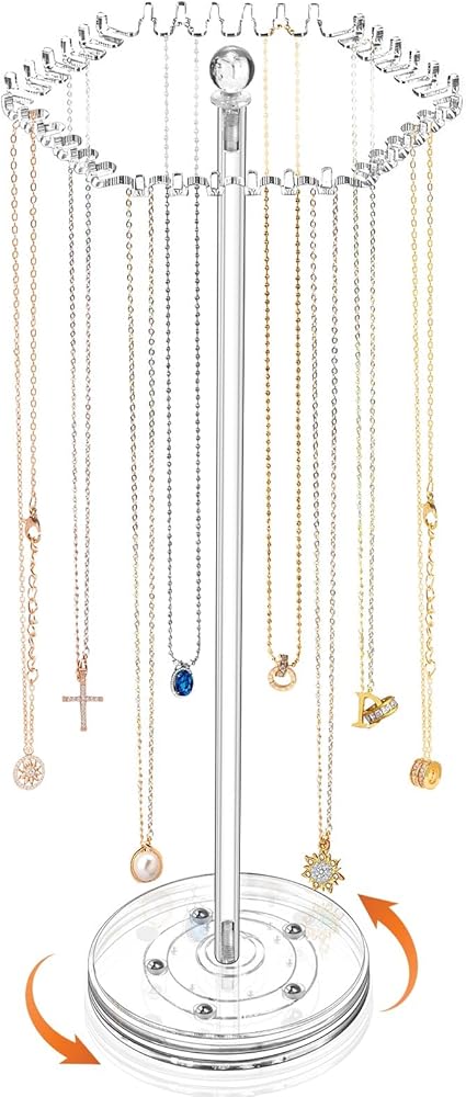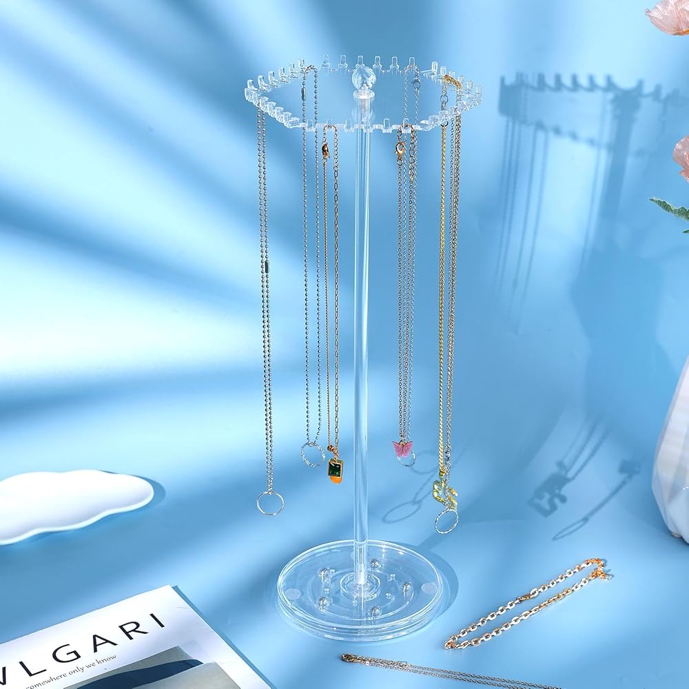 💎【Small and 360°Rotating】: The body of the necklace holder for girls is long and thin, and the top is not big but has 36 separate small hooks, so you can put acrylic jewelry stand at any corner to save space rotating to the desired position. You don't have to worry about the necklace getting tangled up again!