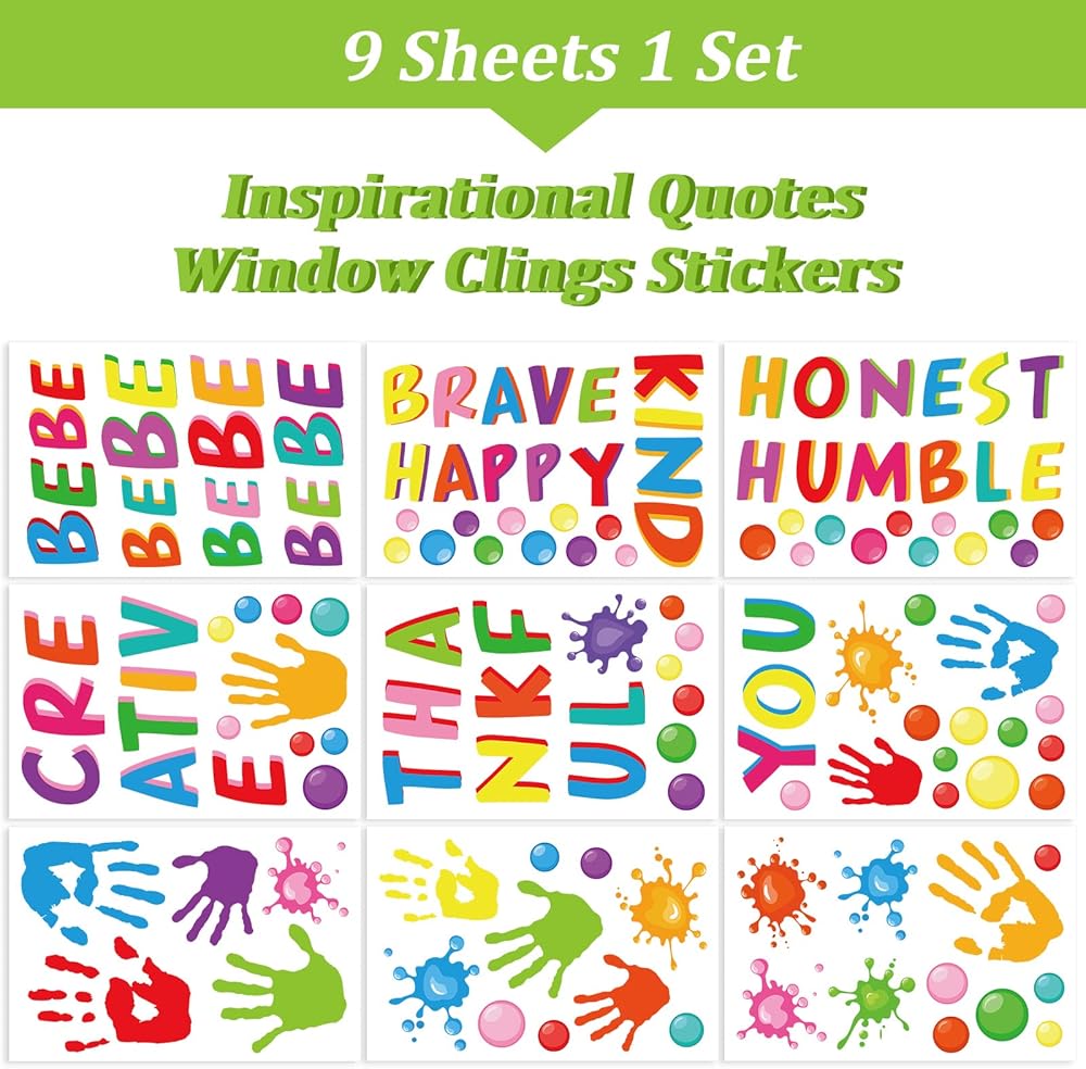 Inspirational Designs - 9 sheets window clings are all in different designs and colors, each sheet measures 20 x 30cm / 7.8 x 11.8inch, printed with inspirational quotes and colorful handprint and polka dots patterns, let everyone know good personalities and bravely believe in themselves.