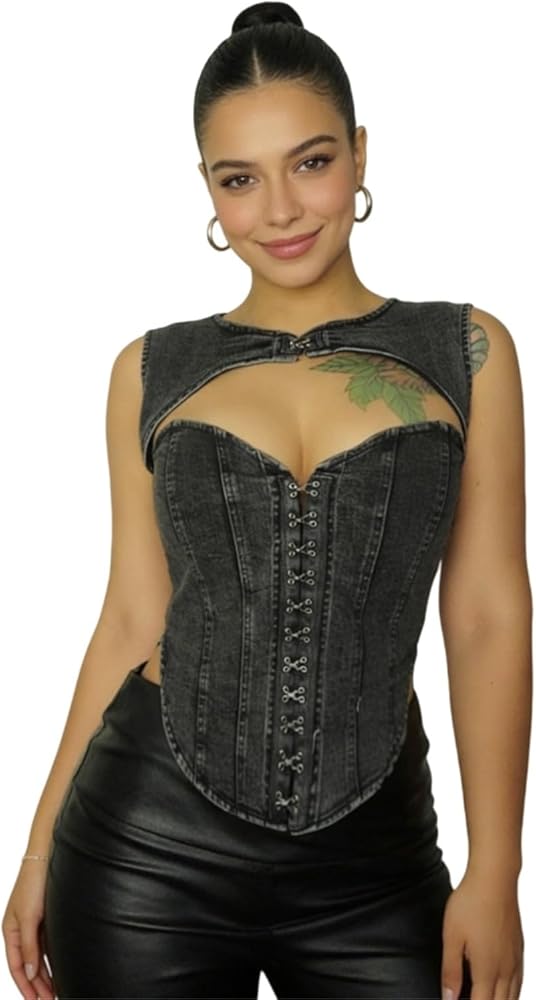 ZGMYC Women's Sexy Sleeveless Denim Corset Top Hollow Out Overbust Bustier Jean Cami Top Body Shaper Clubwear