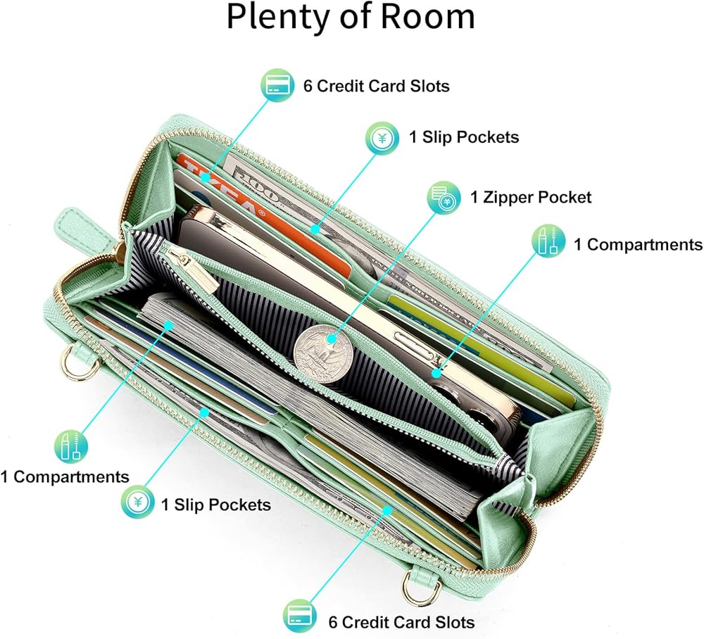 [Big Enough]:This women's wristlet has 12 credit card slots, 2 cash compartments,1 zipper purse,1 checkbook slot.Plenty of room to carry our iphones, cards,cash money , coins, and receipts, ID cards, driver's licenses, or everything else you need.