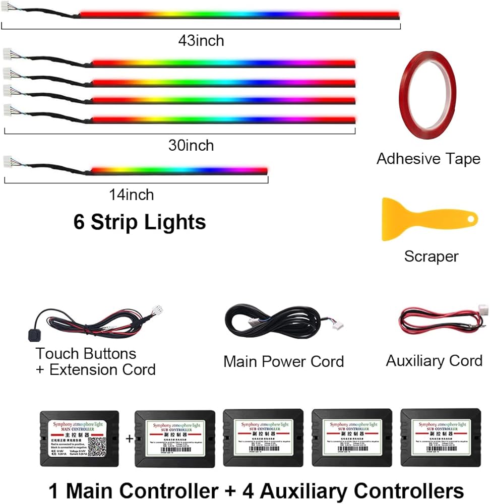 [PACKAGE CONTENTS]:6-in-1: 6 light strips + 1 main controller + 4 auxiliary controllers + power cord + touch button + extension cable + auxiliary cable + scraper + tape. We provide a two-year warranty. If you have any questions about the product,please feel free to contact us and we will provide you with a satisfactory solution!