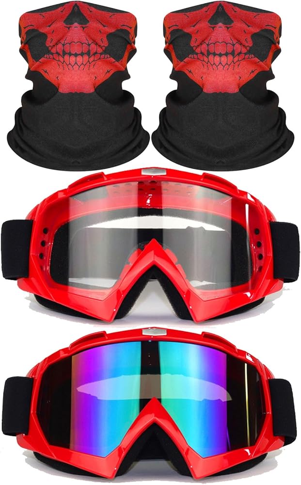 Package: 2 motorcycle goggles with t color-matching skull face masks. The lenses color of the goggles is colorful and clear. The seamless multifunctional magic bandana can be a riding mask, warm neck gaiter, or halloween props, versatile skull face mask.