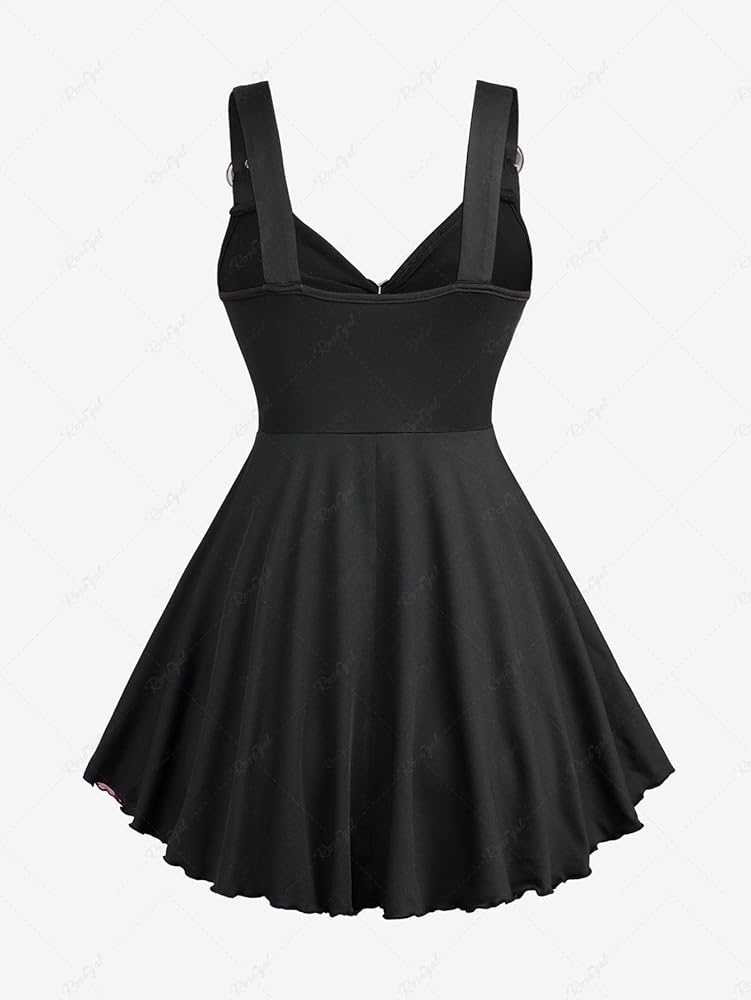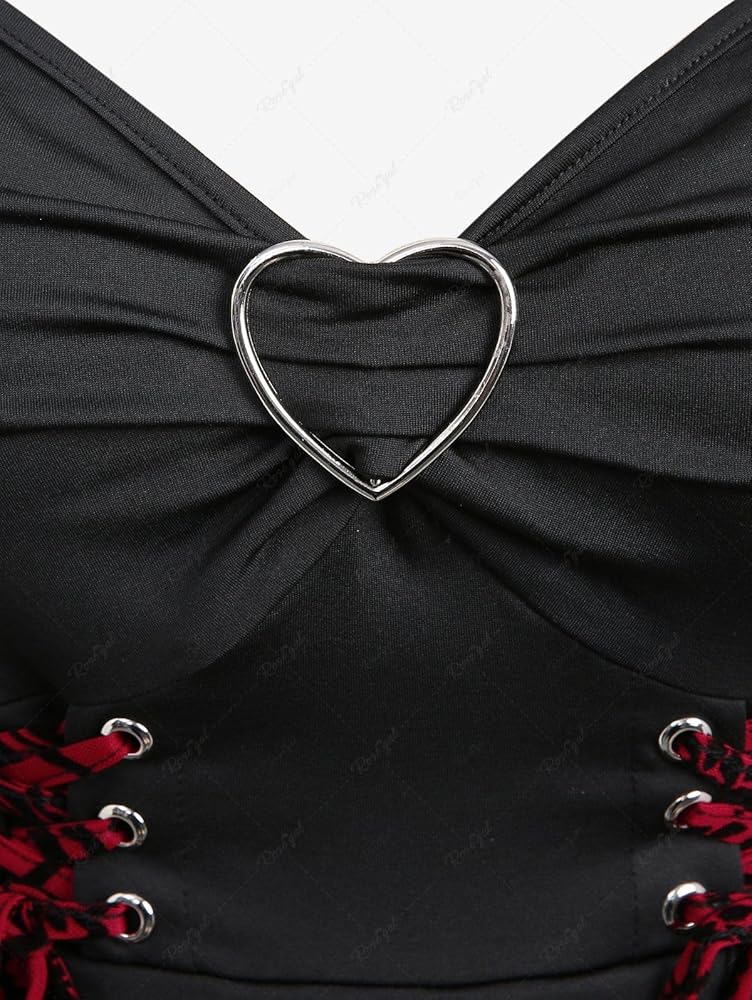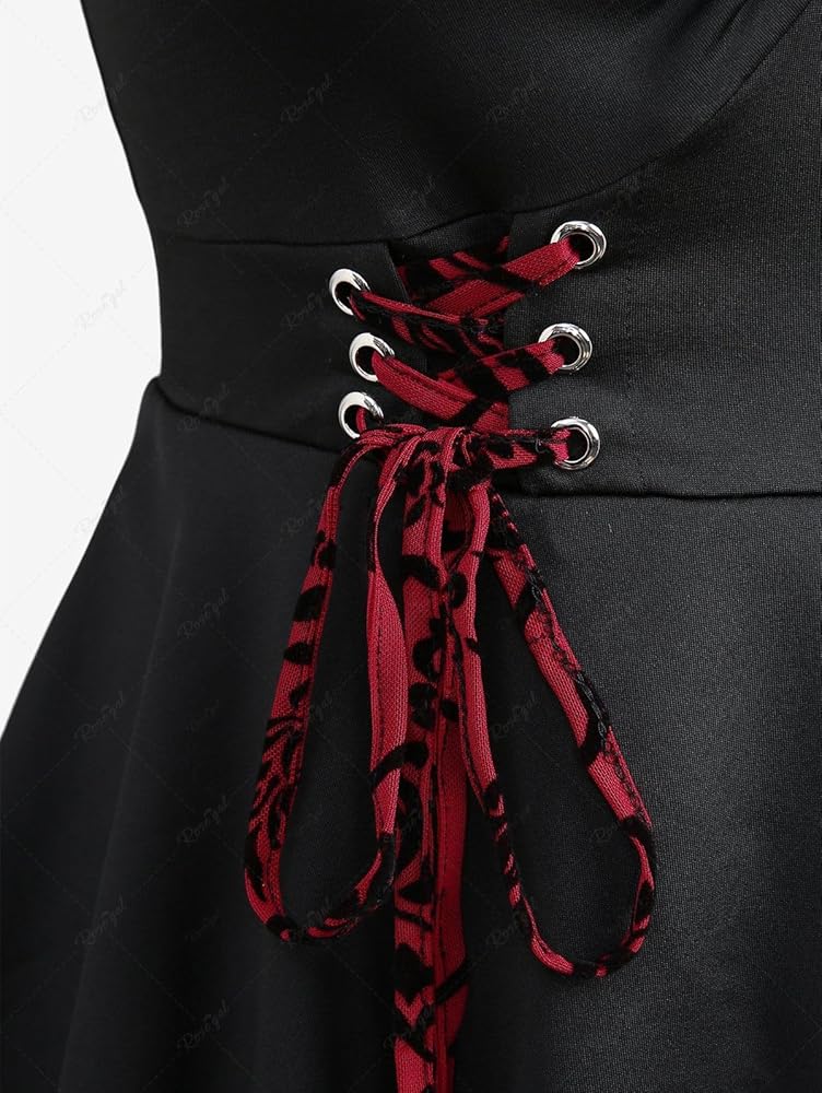 Featurel--Gothic Tank Top,sleeveless wrap tank top,adjustable buckled strap tank top,swing hem,lace-up detail,heart-ring ruched design, flocking floral design.