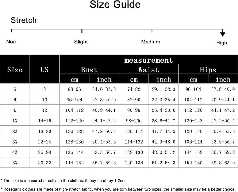 PLUS SIZE--S,M,L,XL,2XL,3XL,4XL,5XL, We have your size. We focus on plus size clothing and offer superior service. Little tip: Rosegal's clothes are made of high-stretch fabric, when you are torn between two sizes, the smaller size may be a better choice.
