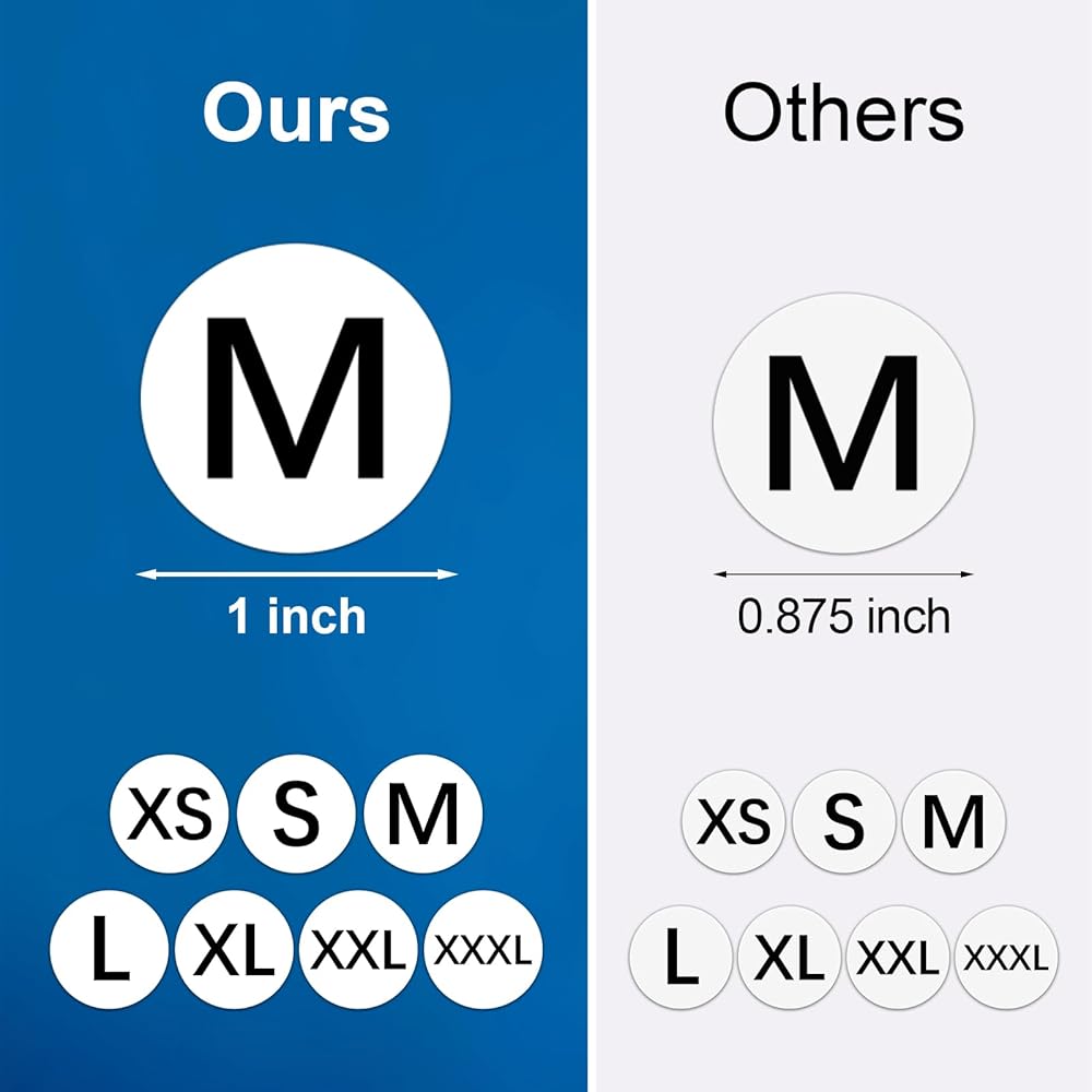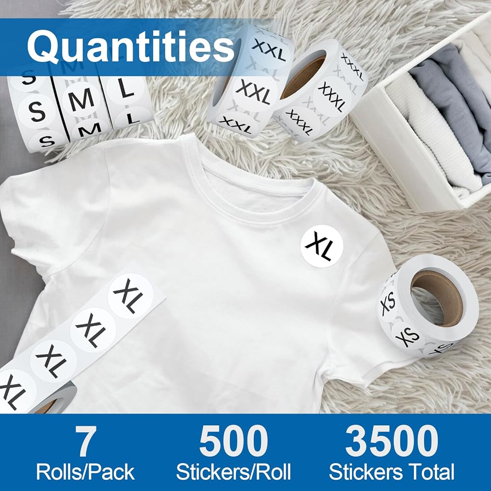 Package Including - 7 sizes of 3500 pcs 1 inch size stickers for clothing (XS, S, M, L, XL, XXL, XXXL), each size has 500 stickers, enough to meet all your needs.
