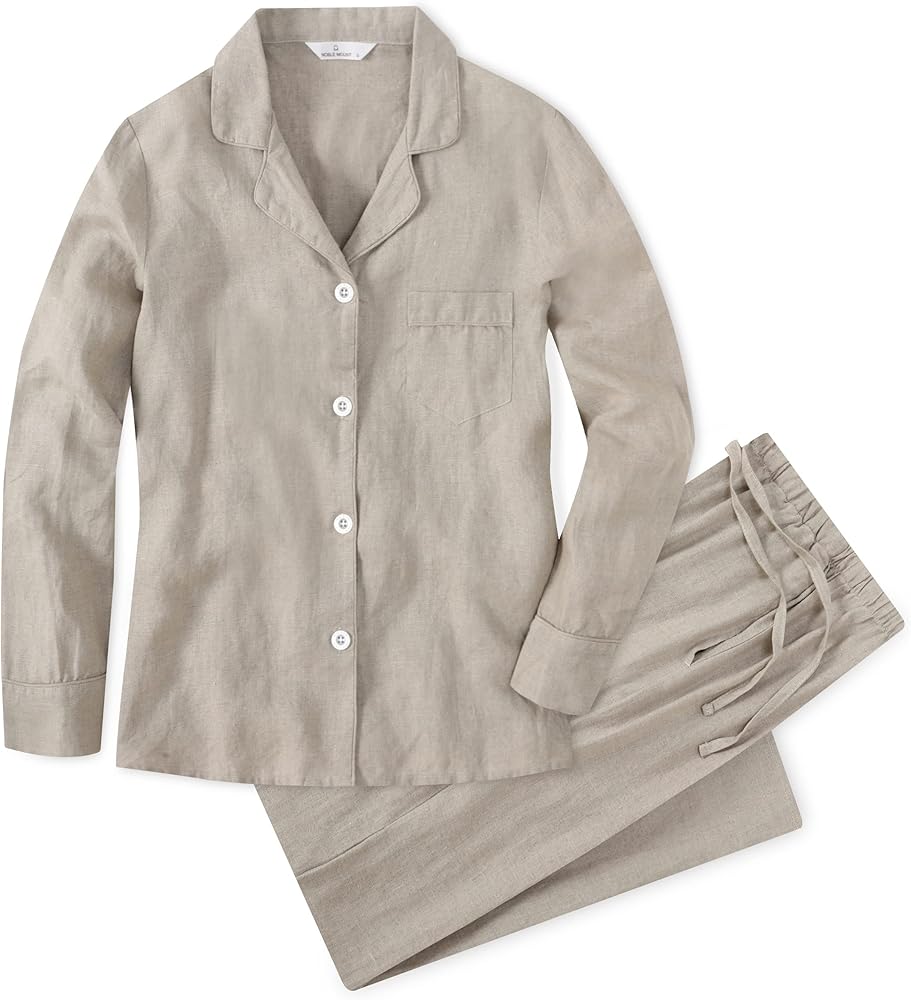 Nothing spells summer like our Noble Mount Womens Linen Pajama Set. No matter the heat, you can seek comfort and softness in this linen pajama set. The material is lightweight and smooth. Our pajamas are made from 100% pure linen imported from Belgium (where the world's finest linen fiber is grown). Linen is 100% natural fiber without any synthetics. The natural crease that linen provides is a look in summer that spells comfort. Linen is naturally absorbent and the fabric moves with you and doesn't stick to the skin. Once you feel how cozy it is, this pajama will be the only thing you'll need for summer. Take it on your next tropical vacation or lounge in the luxury of linen every day.