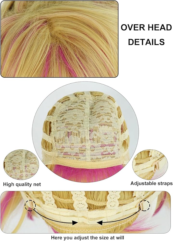 Cap Size:Short wavy blonde and pink wig for len is thoughtfully designed with 2 adjustable straps, 2 hooks and soft breathable material structure; it could be adjusted easily to fit different people head sizes
