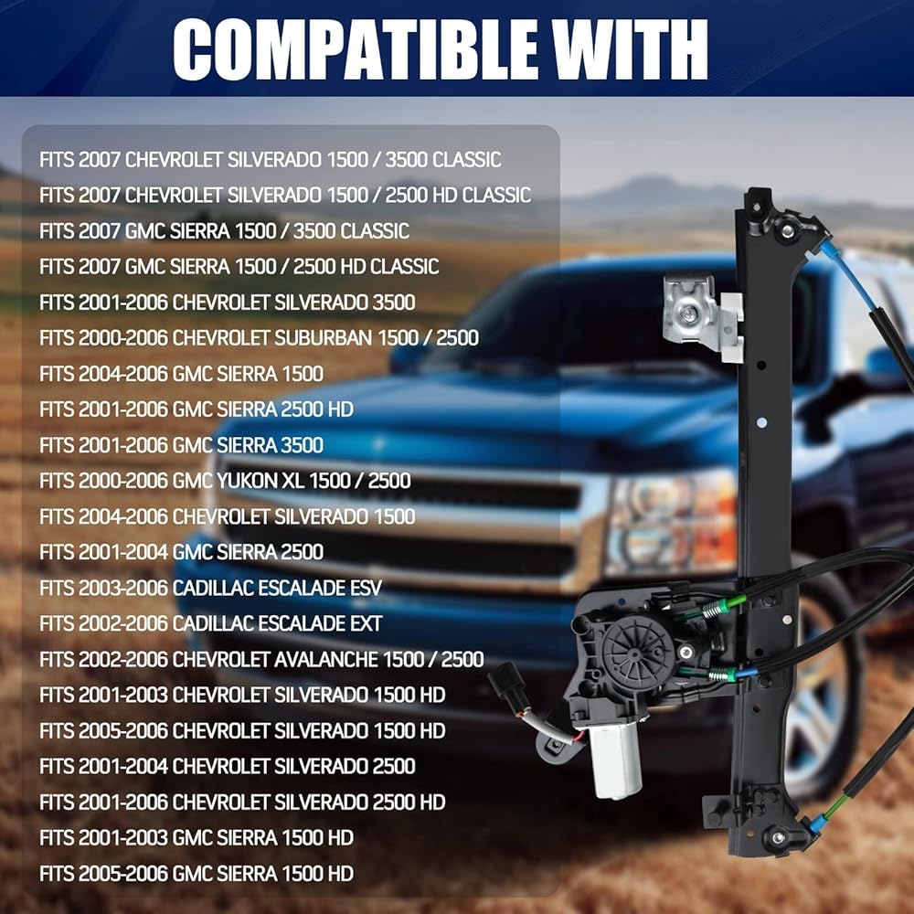 Note: Power Window Regulator And Motor Assembly Compatible with Cadillac Escalade, Chevrolet Avalanche / Silverado / Suburban, GMC Sierra / Yukon XL Models. Plz make sure your car model fits.