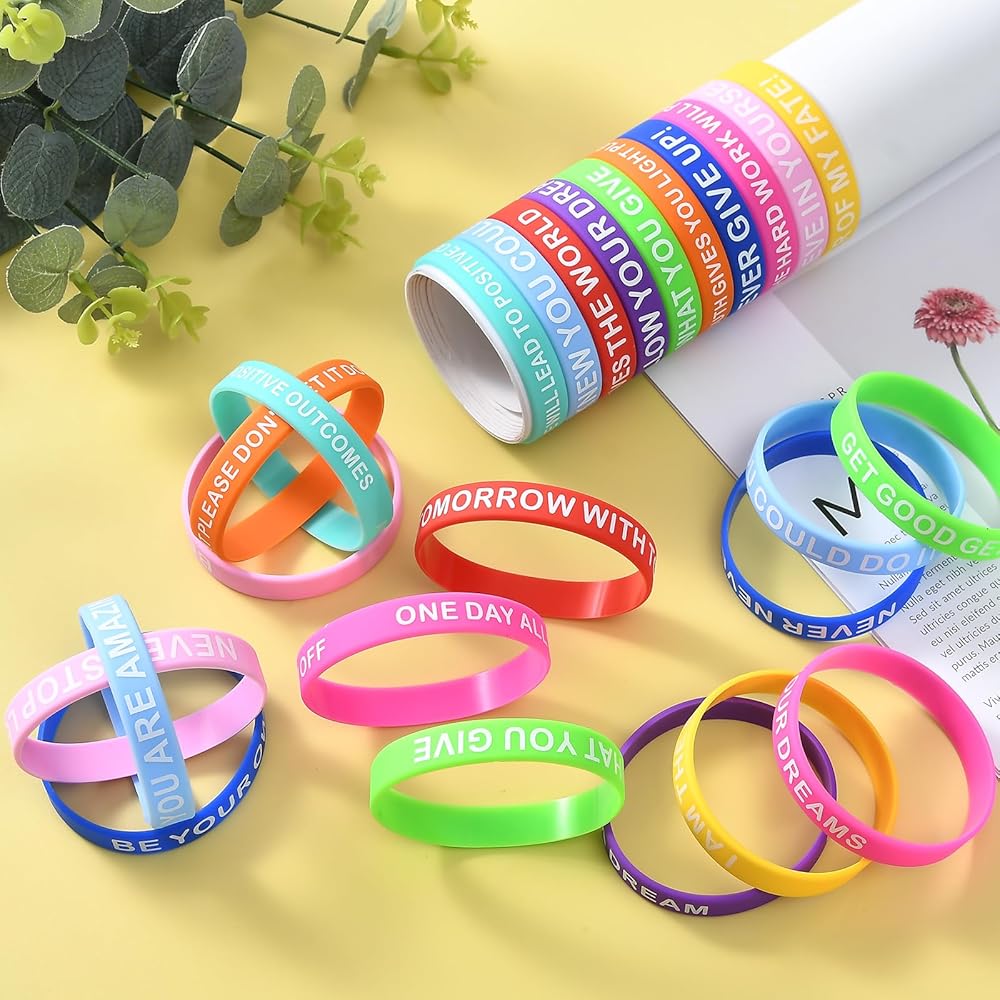 Motivational Bracelet: Colorful elastic bracelets printed with different upbeat messages such as "Never give up," "Believe in yourself," "Let your light Shine," and "I knew You could Do it" add glamour, show your attitude, and make you look cool and chic