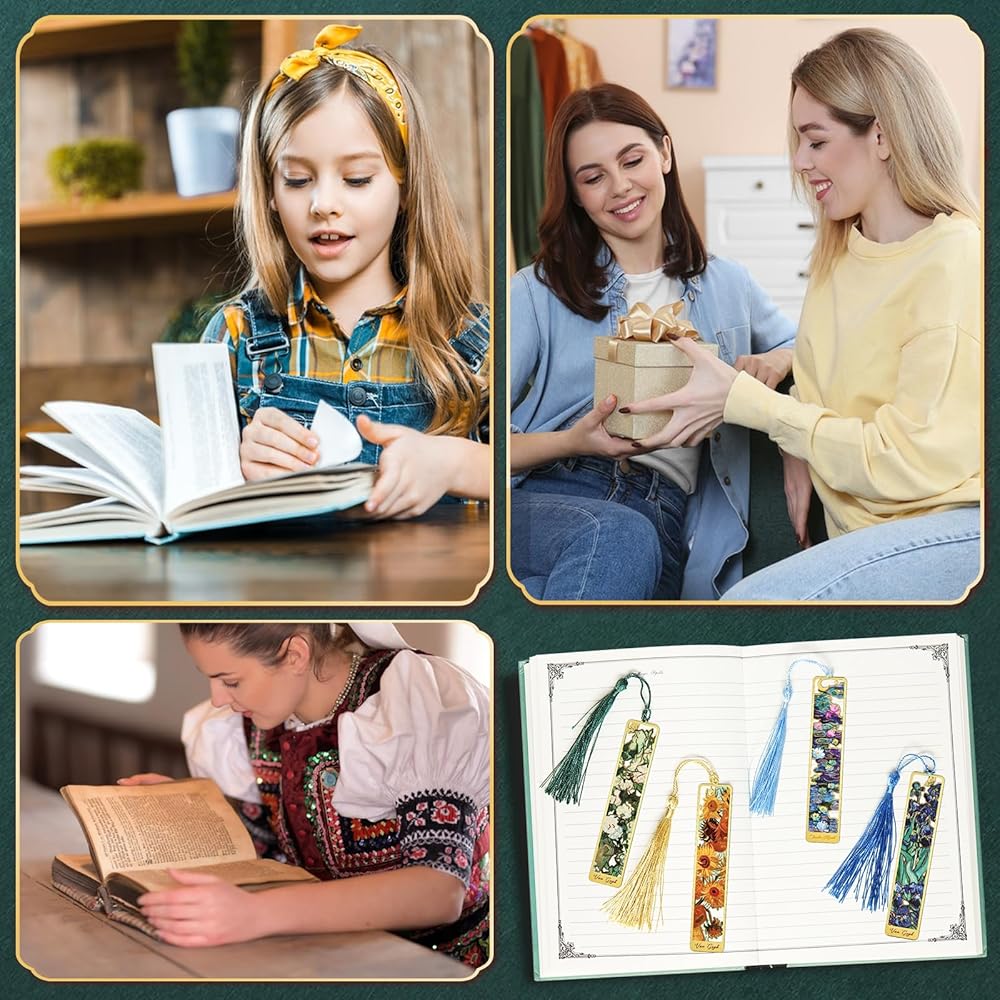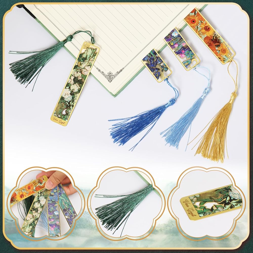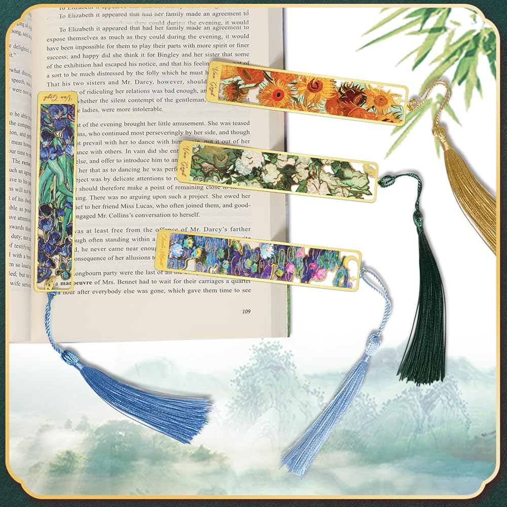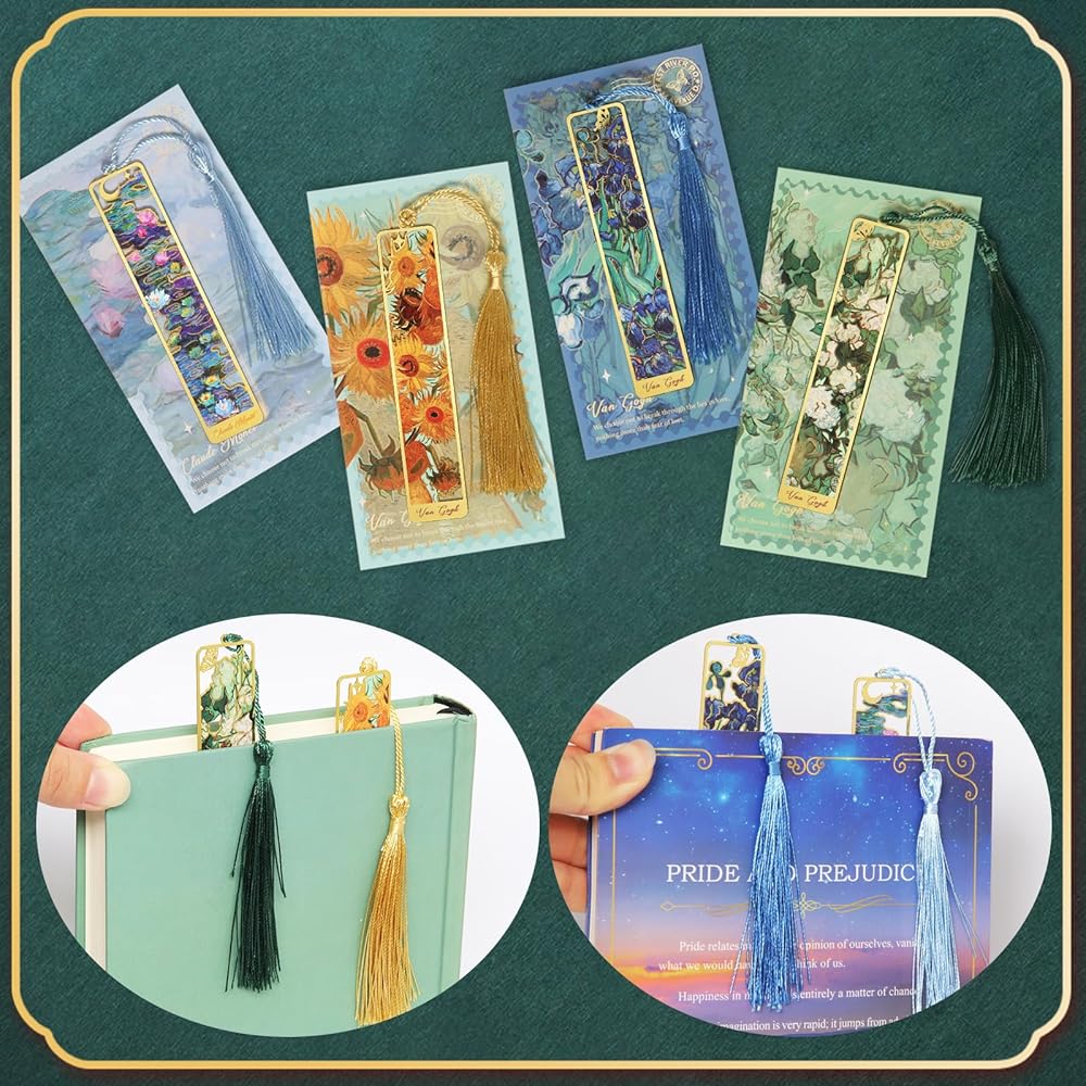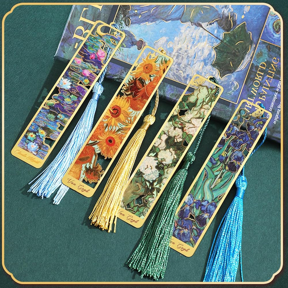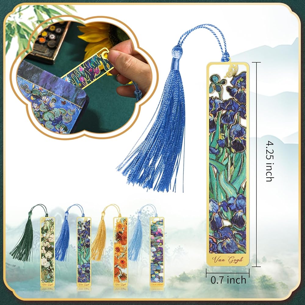 4 pcs metal bookmarks with different style, each bookmark is 4.25"*0.7", oil painting theme with sunflower white rose water lilies and iris.It is exquisite, elegant and unique, increasing the interest in reading.
