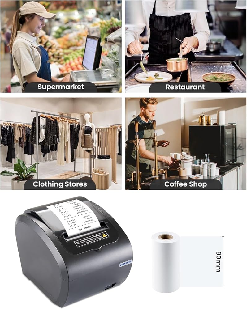 Excellent Performance: Direct row thermistor, printing without ink, toner or ribbon -- print rich, spend less. The thermal receipt printer has overheating protection function, long service life, fast character printing speed and reliable performance. This is a good choice for printing receipts in shopping centers, supermarkets, retail, hotels, offic restaurants