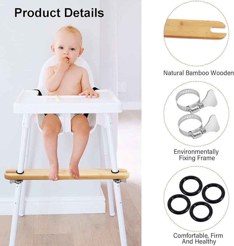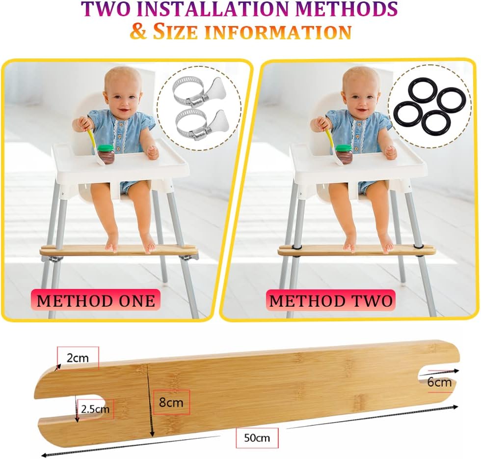 👍【Easy to Put on】 No tools are needed, this antilop high chair footrest easy to put on and matches the high chair perfectly. Just put the rubber rings and footrest to the correct height, then tighten them up. Please noted that the package includes 1 piece of the bamboo footrest, 4 pieces of rubber rings, and 2 pieces of fixed frames, the highchair is not included.