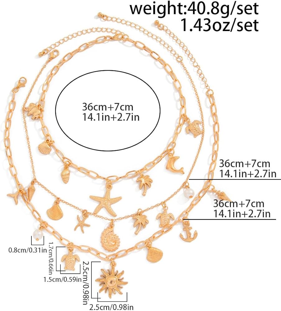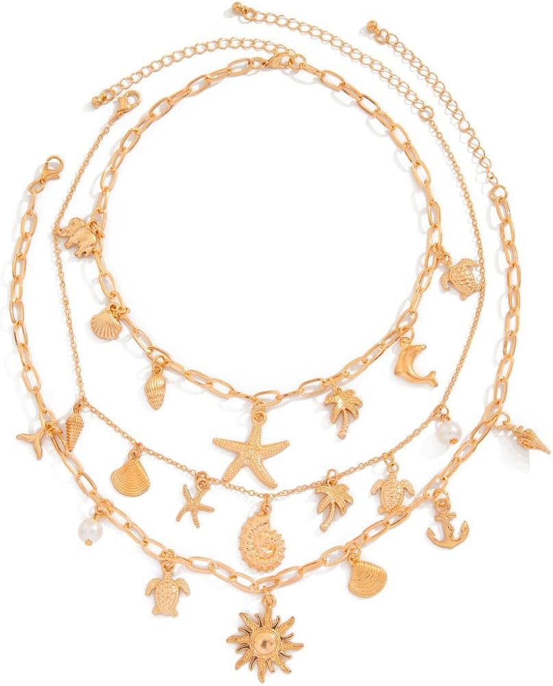Starfish necklace: Crafted with a delicate layered design, this shell charm necklace features a stunning combination of pearls, seashells, and a starfish charm. Layered Seashell Necklace: Crafted with a delicate layered design, this shell charm necklace features a stunning combination of pearls, seashells, and a starfish charm.