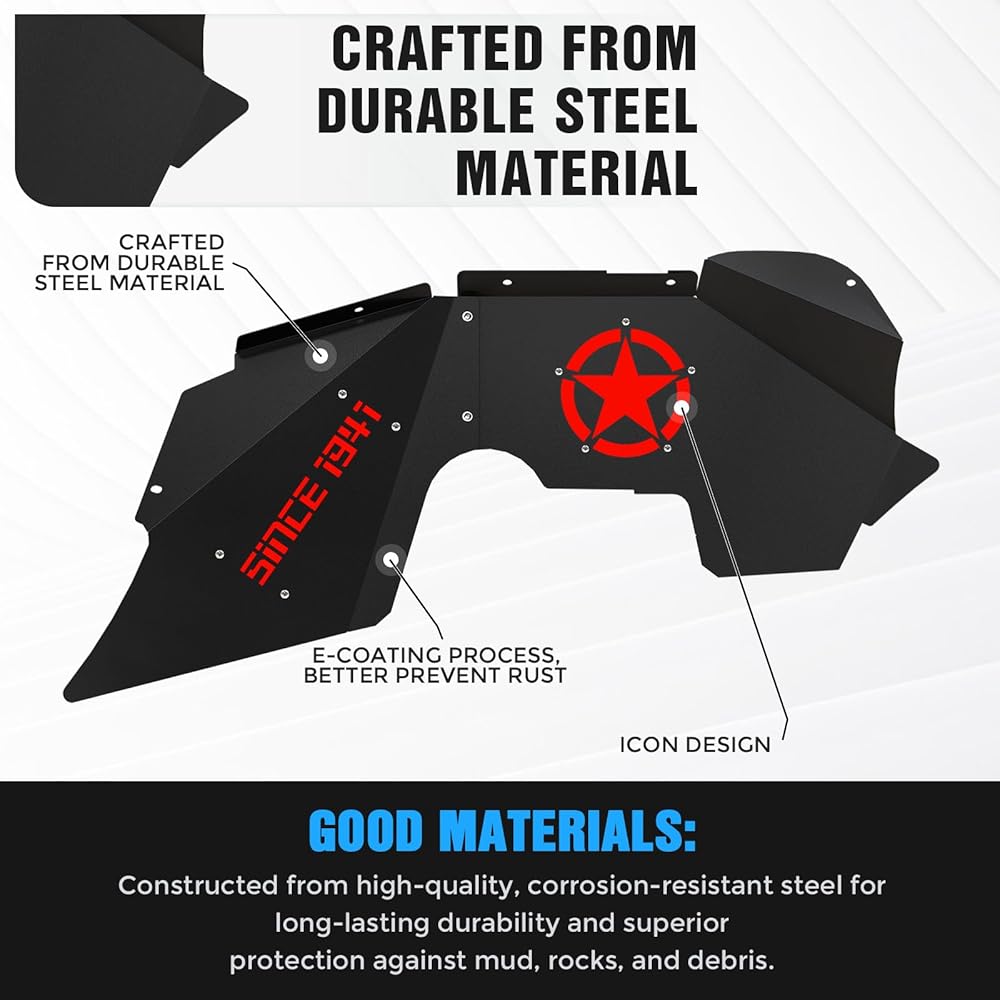 【Premium Materials】: Constructed from high-quality, corrosion-resistant steel for long-lasting durability and superior protection against mud, rocks, and debris.