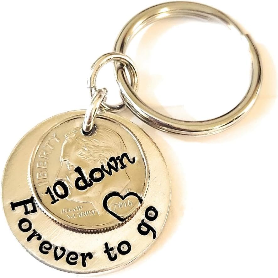 Celebrate a decade of love with this unique 10 Year Anniversary Keychain designed intricately to commemorate your special milestone. Handcrafted with a real US 2014 dime and attractively stamped with "10 down" and "Forever to go" this silver aluminum keychain is a captivating anniversary gift for husband or wife and a special keepsake for any married couple. Let the memories take flight as you gift it to your better half or make another couple's day by presenting it as a thoughtful gesture.