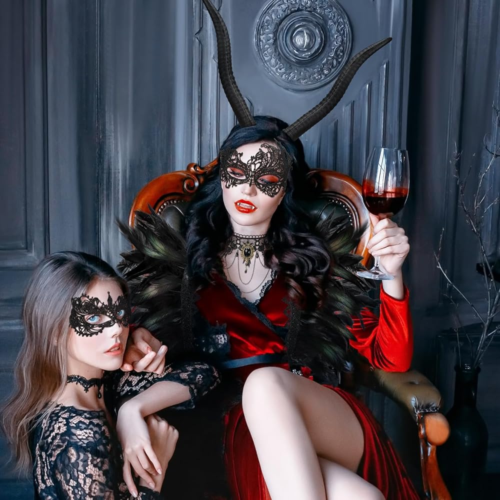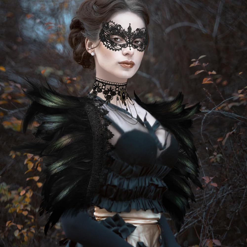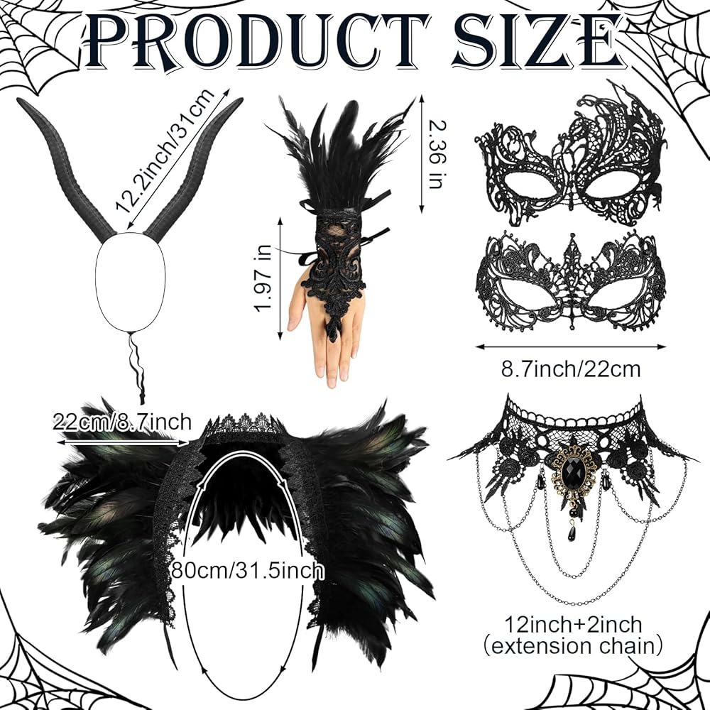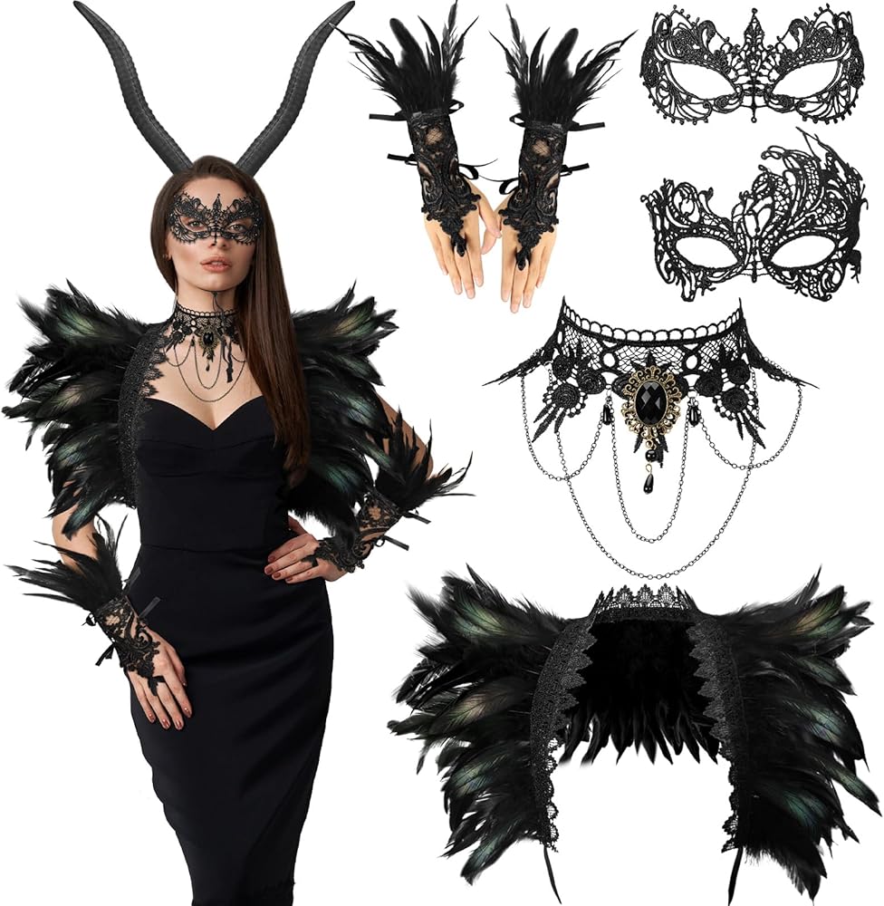 Everything You Need for a Complete Look: the Halloween gothic kit includes multiple accessories, 1 black feather shrug cape, 1 pair of black feather lace long gloves, 2 masquerade ball mask, 1 lace gothic choker, as well as 1 horn headband, which means you don't have to search for individual pieces, has everything you need for a complete look, making it a convenient choice; The accessories can also be mixed and matched with other outfits