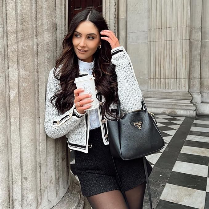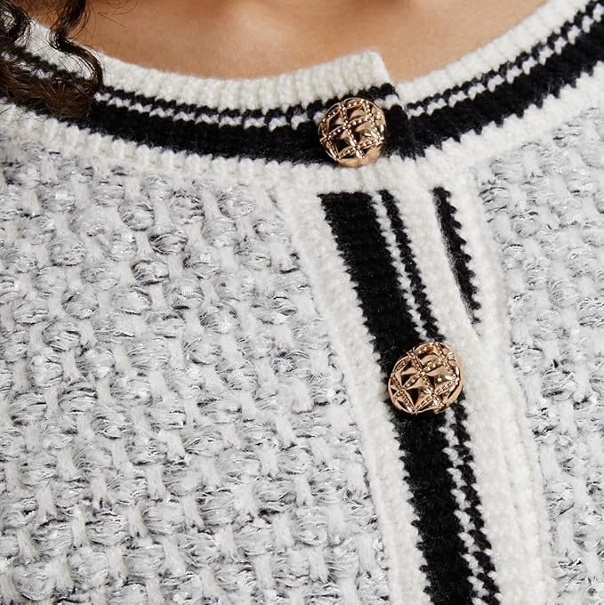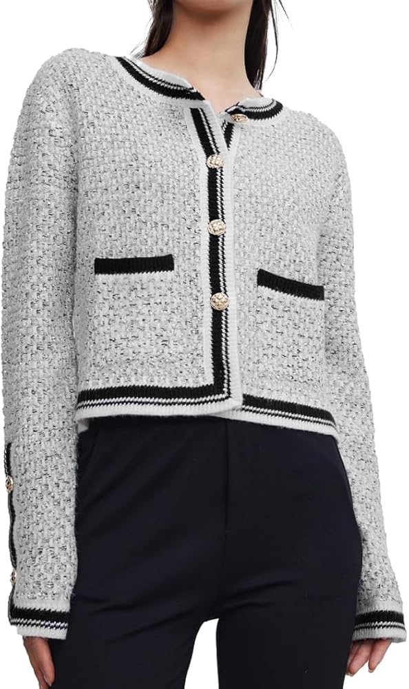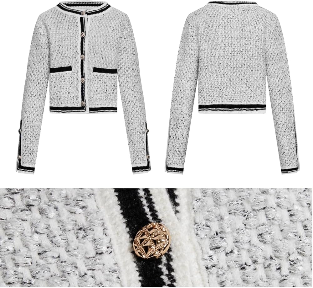 UNIQUE DESIGN - Knitted cropped cardigans for fashion women are exclusively designed. Metal button on the front placket, alternating black and blue threads forming a plaid, ribbed trim at closure, 2 buttons decorating the cuffs, and 2 pockets. The long-sleeved short cardigan is both fashionable and functional.