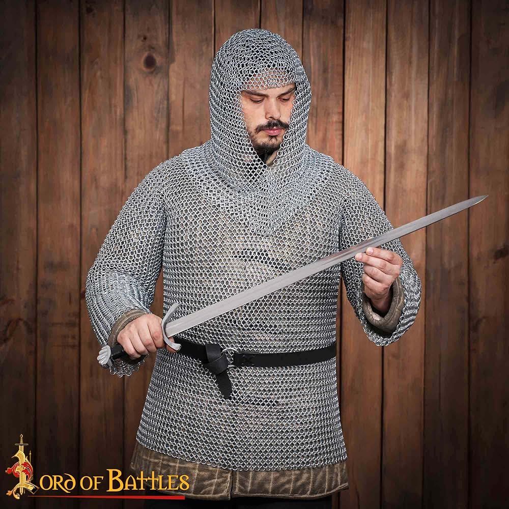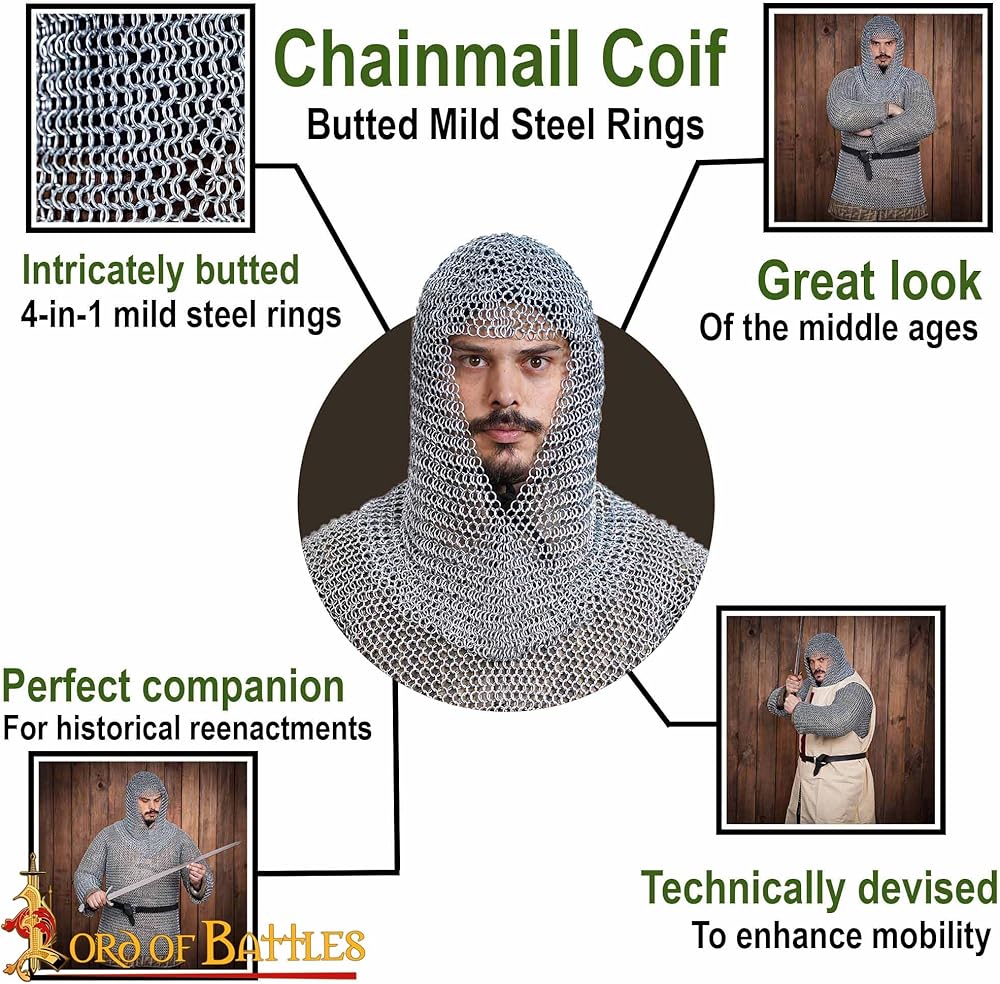 It is intricately handmade from butted 16 gauge mild steel rings, each with a diameter of approximately 10 mm. It is this feature of being butted that makes it affordable and hence, popular in LARP, Renaissance fairs, and other medieval events. It has a total length of about 48 cm and is ideal for a head circumference ranging from 55-65 cm. Weighs about 2 kg 200 grams. ..