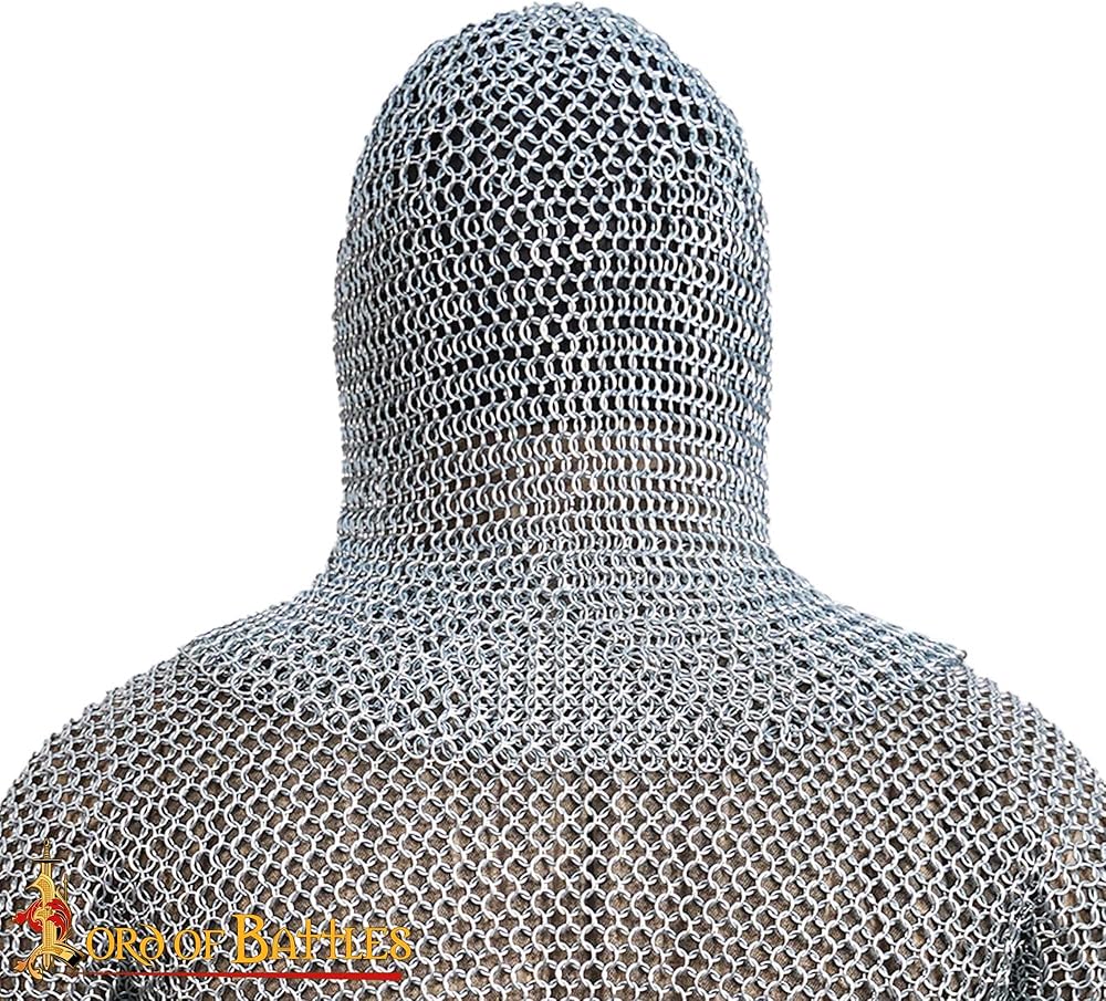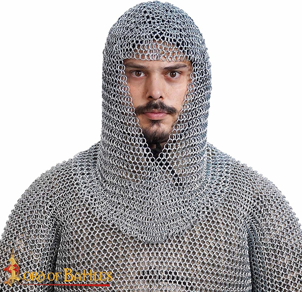 This V face chainmail coif/hood is the classic chainmail hood popular in LARP, reenactment medieval events. It would be the perfect protection under your favorite kettle hat or even worn as your main head protection for your favorite character. ..