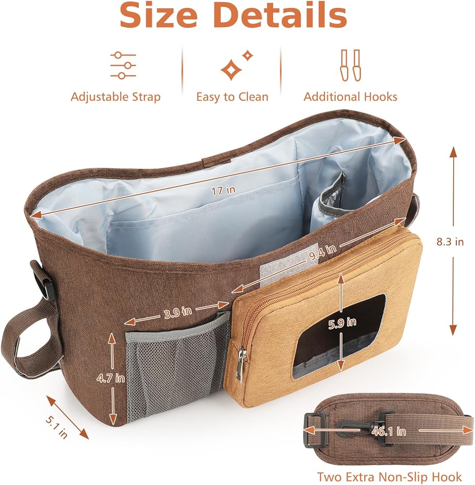 Multi Structure: This stroller storage organizer equipped with multifunctional structure: Insulated cup holders on both sides to place baby bottles and drink cups; The middle large compartment can accommodate baby diapers, wipes, pacifiers, teething toys and other accessories; Equipped with a convenient wipe pocket for easy access of wet wipes; Mesh phone pocket keep your phone within reach; Secure back pocket for wallet or other important items.