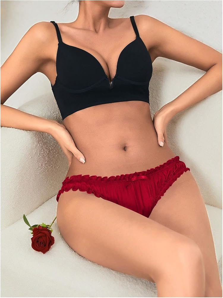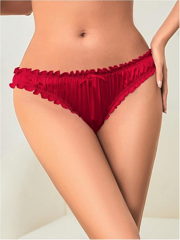 - Feature: Satin, Frill Trim, Ruched, Bow Back, Low Waist, Cheeky Underwear, Plain