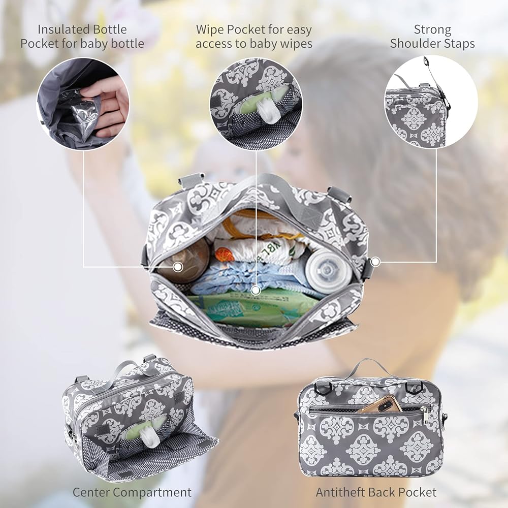 MUTI POCKETS - 1 Insulated Cup Holder for baby bottle, 1 seperate wipe pocket for easy access to baby wipes, capacity for baby items like diapers, clothes, toys, 1 back pocket for mom's phone, keys.