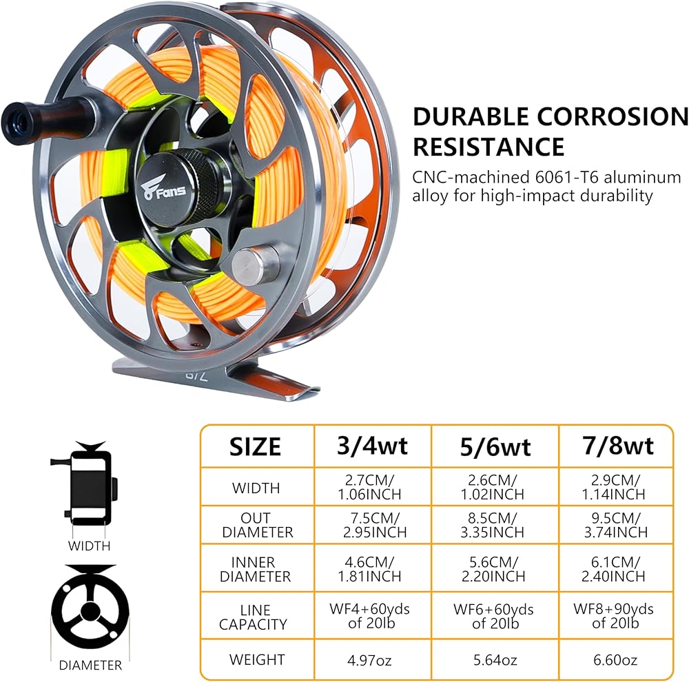 PRE-LOAED FLY REEL:8Fans fly reel is made of CNC-machined 6061-T6 aluminum alloy.2+1 Ball Bearings and 1:1 Gear Ratio, One-way roller bearing engages drag in one direction,Strong All-aluminum construction.The surface adopts anode anti-corrosion oxidation technology.It is pre-loaded with WF-3F 80FT fly line(Orange), 20LB-30M backing line(Yellow), and 9FT-5X tapered leader nylon(Clear). It is very suitable for fishing lovers and beginners.