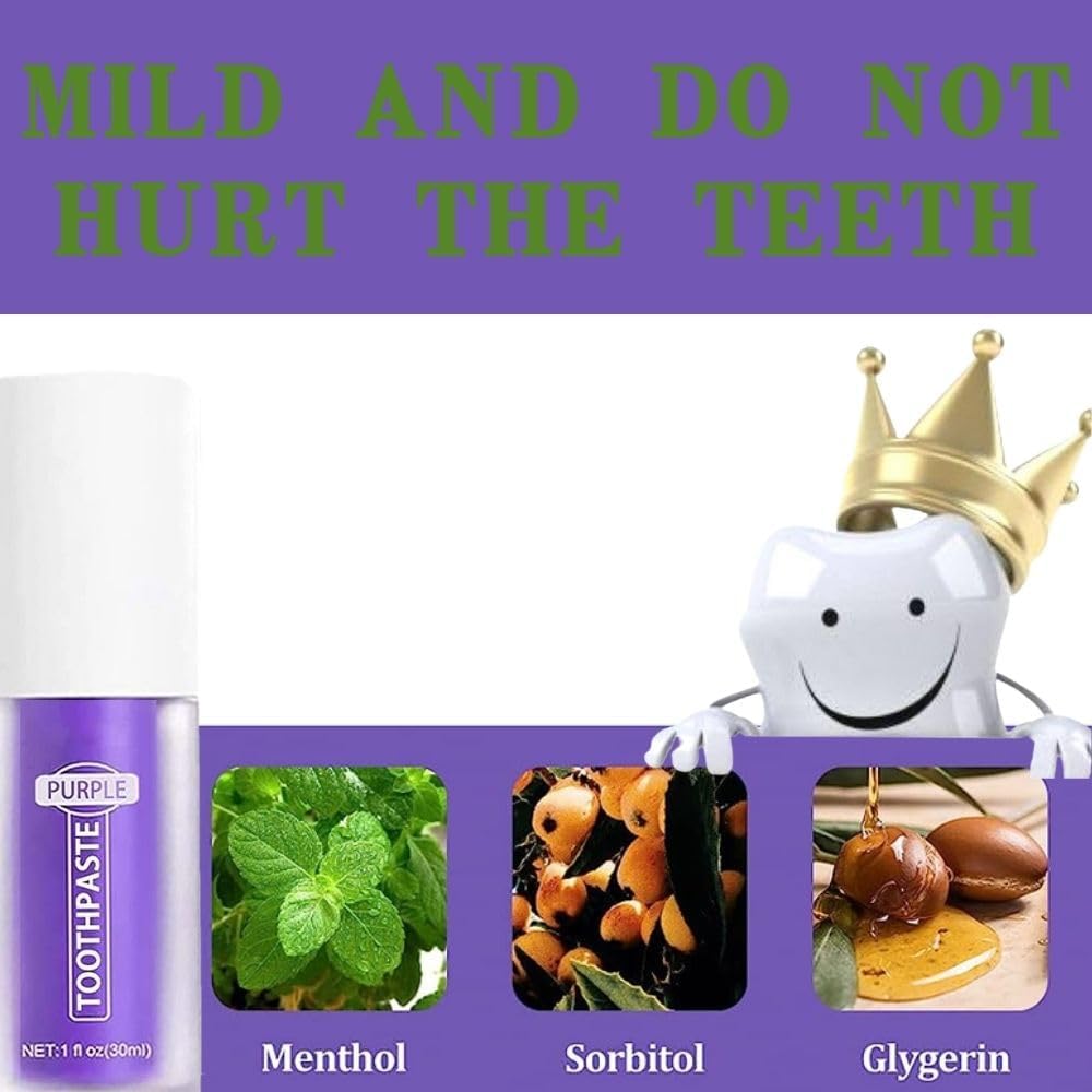 Purple toothpaste for teeth whitening, uses the latest whitening technology to quickly remove yellow stains and pigment on the surface of teeth and restore the natural whiteness of teeth. Compared with traditional toothpaste, purple whitening toothpaste is more der and does no harm to the teeth. It uses a natural plant extract, does not contain any harmful ingredients, and is safe without side effects.