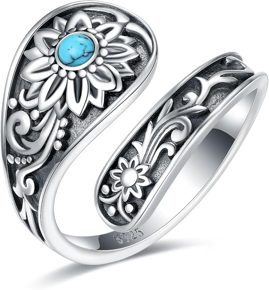 Sterling-Silver Sunflower Spoon Rings - Sunflower Turquoise Adjustable Ring Boho Victorian Vintage Flower Thumb Statement Rings Jewelry Gifts for Women
