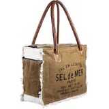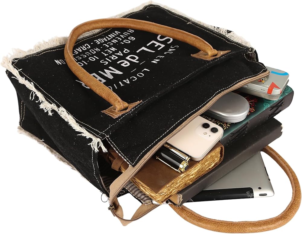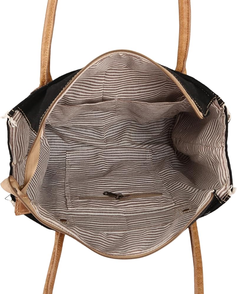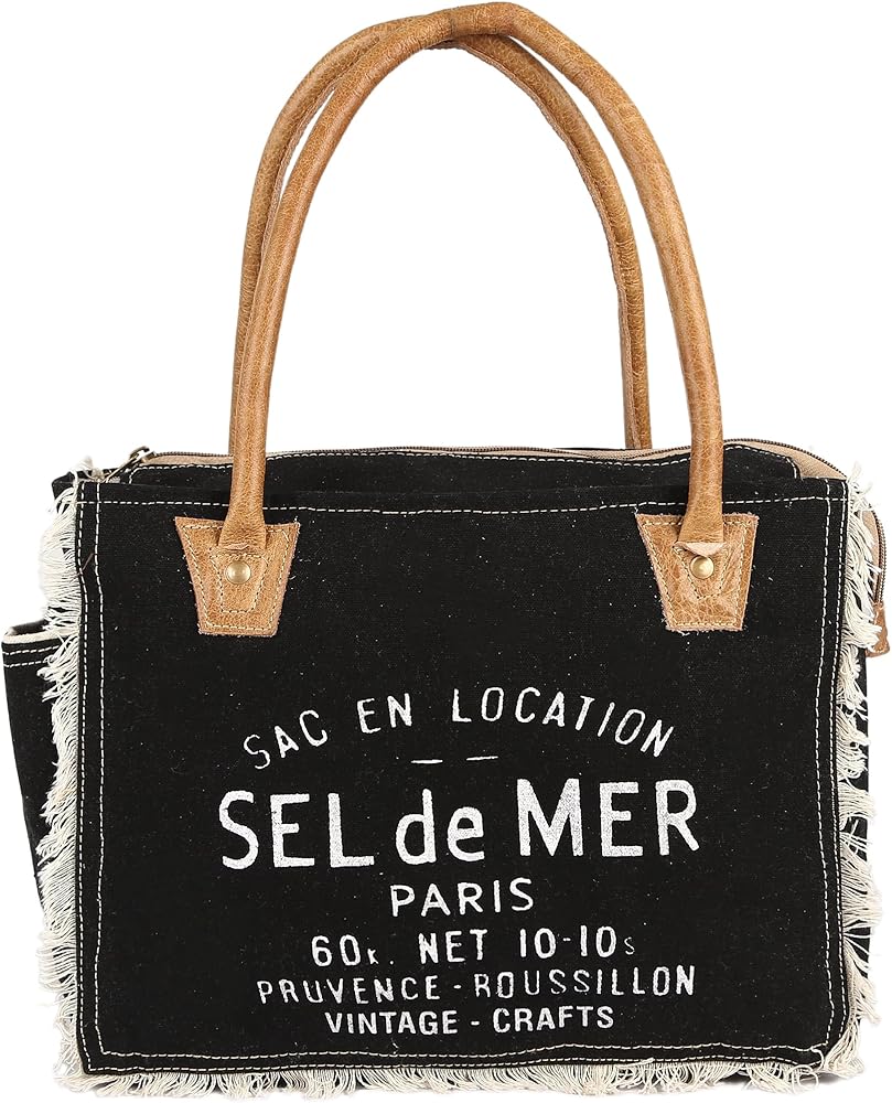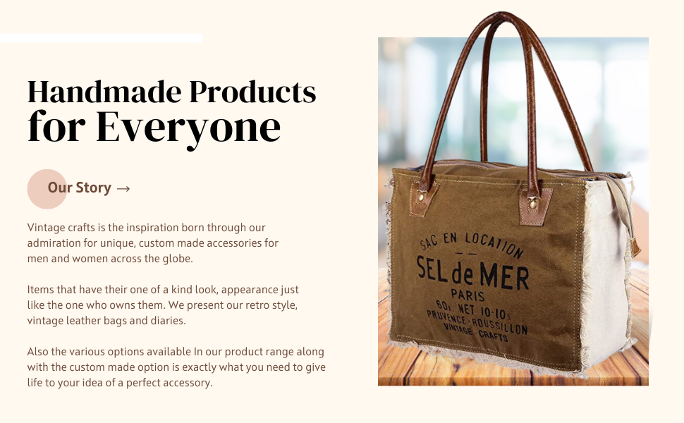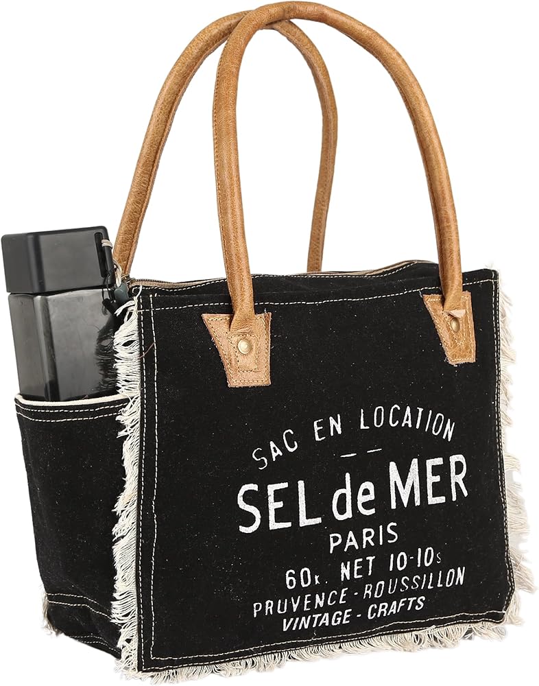 Canvas,Premium Leather Leather lining Zipper closure {Lightweight Canvas Purse} Introducing Vintage Crafts Women's La Couspaude Tote Bag! This bag is made of lightweight and durable canvas, with stunning colors and a French-inspired print. "THIS ITEM IS NOT INTENDED FOR USE BY CHILDREN 12 AND UNDER." This bag features premium leather for added strength and style. The high-quality canvas construction ensures lasting use, making this tote bag the perfect choice for everyday use. {Perfect for Day or Weekend Trips} With an exterior pocket for your phone, zippered top closure, and one large and two smaller internal pockets, this designer small canvas tote bag will neatly organize your essential items. The womens purse measures 13" by 5" by 9", with a buffalo hide purse strap 8" long. We follow a specific process in the creation of our upcycled canvas purses and handbags which includes material selection, washing, cutting, assembling, sewing, and finishing before our canvas hobo bags pass several quality standard checks. We know you'll love this quality bag. This awesome bag is the perfect accessory for any outfit and features a top zip closure. The fully lined interior provides added protection, while the sturdy leather handles make it easy to carry. With its beautiful French-inspired design, this bag is sure to turn heads. {Handcrafted for Uniqueness} With a classic vintage purse look and a stylish take on western meets boho, this canvas and leather bag makes an excellent Birthday gift, Christmas gift, College gift, New YearÍs gift, Party gift, Anniversary gift, Travel gift, or Vacation gift. Sure to bring admiring comments while also defining your own personal style.