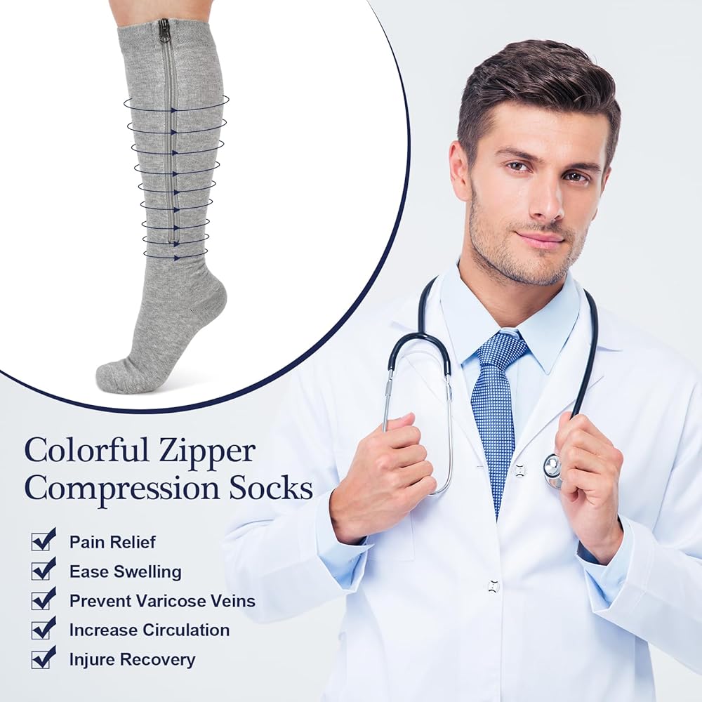 Versatile and Multipurpose: these colorful zipper compression socks are suitable for everyday wear, whether prolonged sitting or standing, and also suitable for running, sports, nursing, travel, office work, and more; These zipper compression socks help relieve muscle soreness and help recover quickly from tired legs