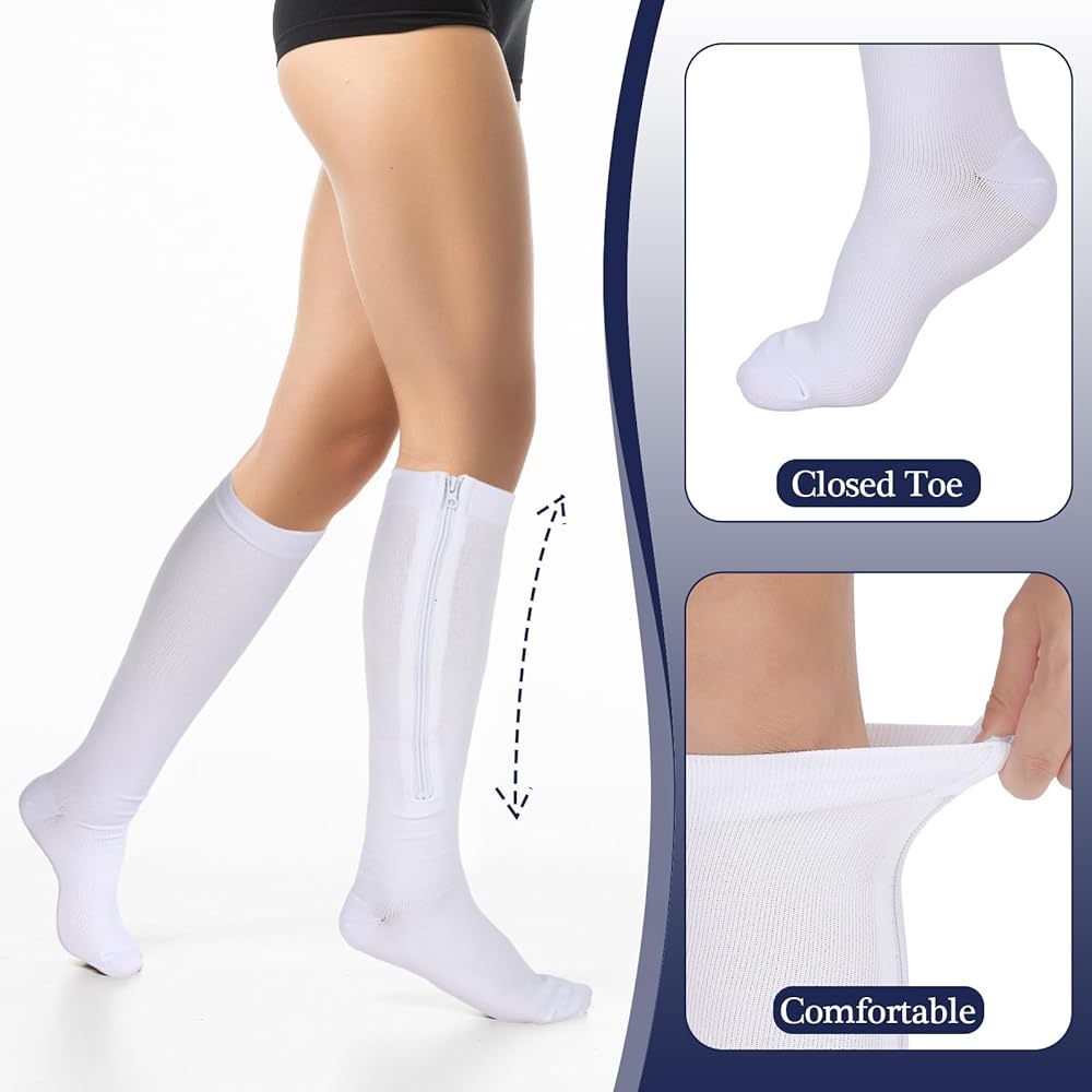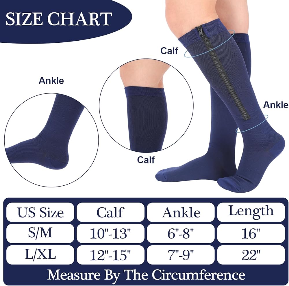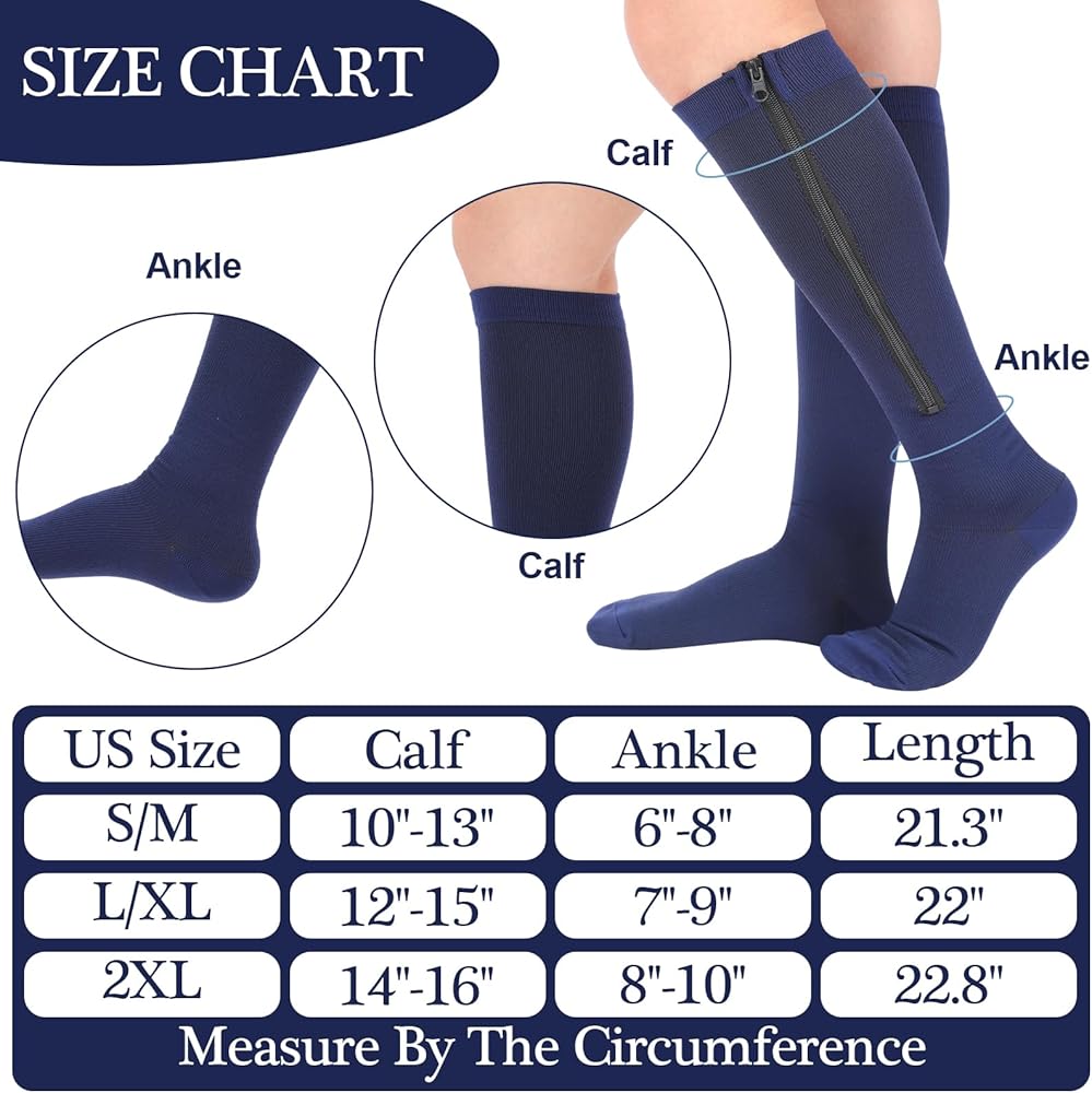 Nice Performance: these zipper compression socks provide gradient compression, maximum at the ankle and taper off, help reduce and avoid swelling, maintain blood circulation and leg health, and help relieve leg swelling during walking, working, and prolonged sitting