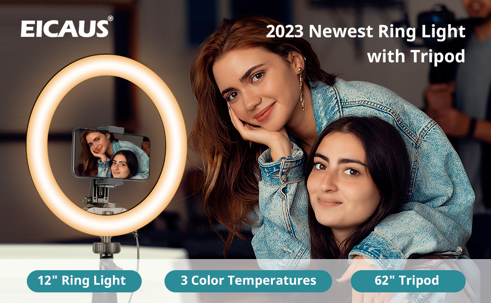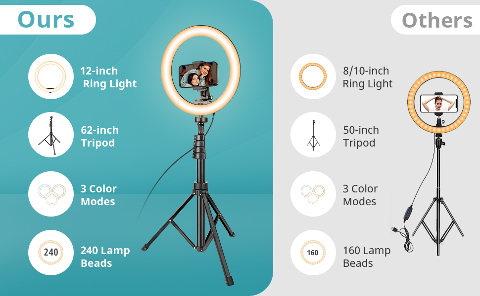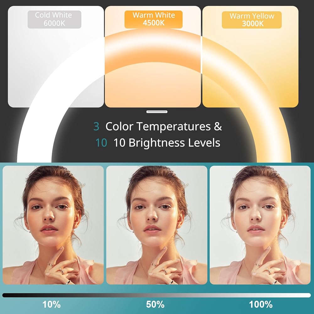 Professional Ring Light Kit: The 12" Ring Light is brighter than 10" models. It offers 3 color temperatures, ideal for photographers and video creators. The upgraded design is skin-friendly, UV-free, and reduces glare, enhancing facial features