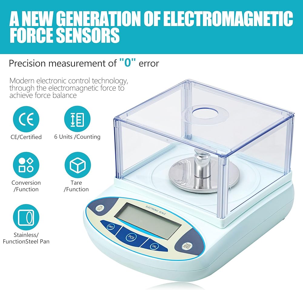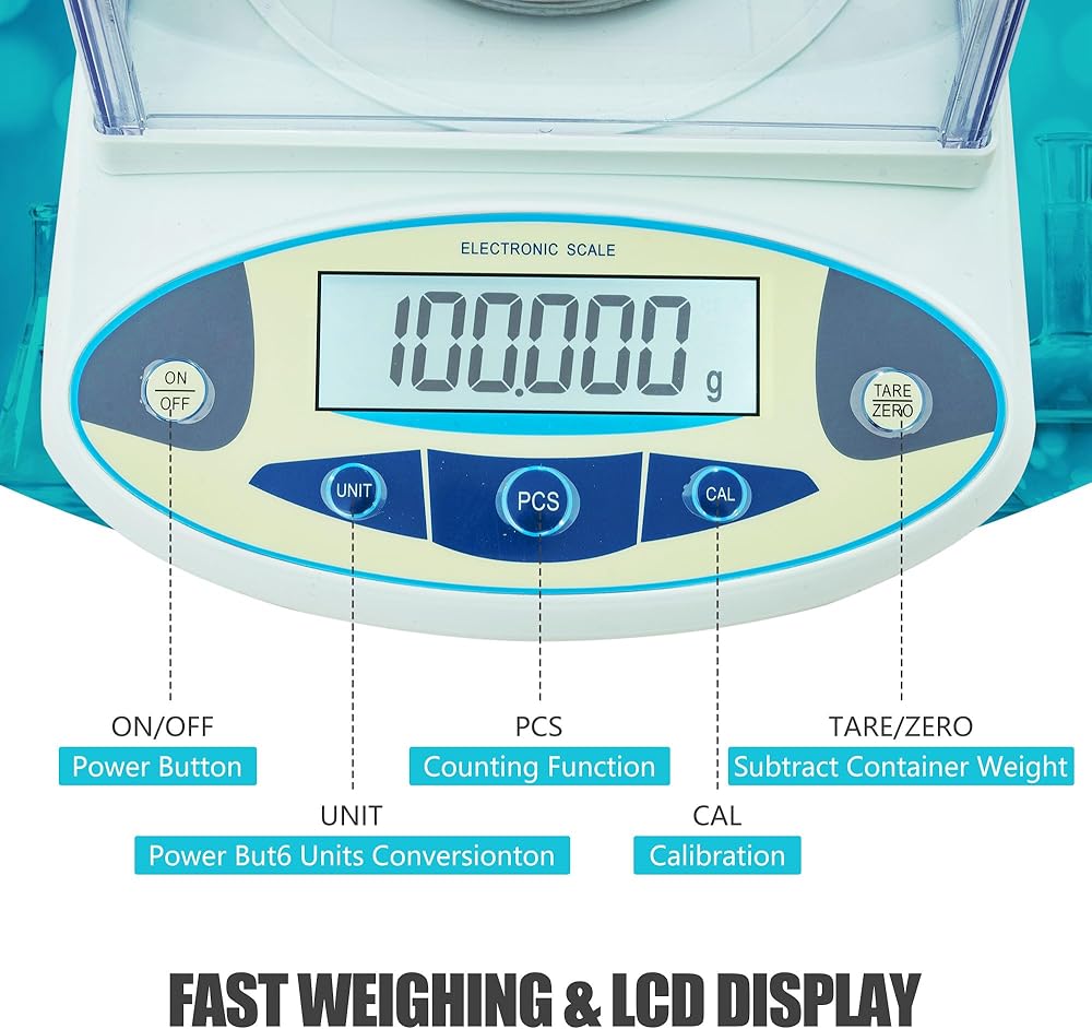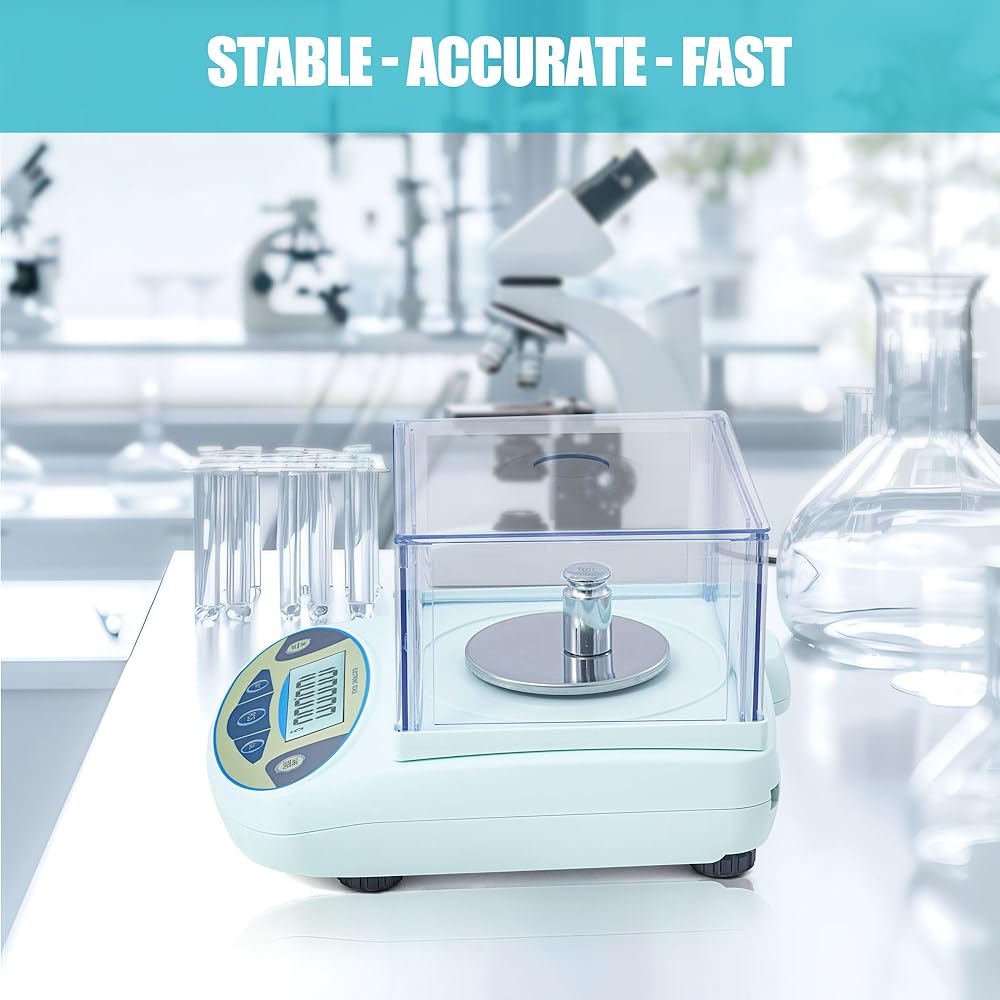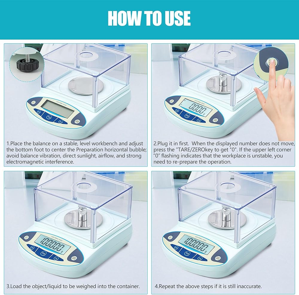 Gram Scale: Accuracy is 0.001g. To ensure fast and accurate results, lab scales are equipped with upgraded highly sensitive built-in sensors, adjustable feet, liquid level bubble overload alarm, error indication and external calibration. The internal structure design is reasonable, easy to clean and maintain, and extend the service life 500g lab scales, calibration weights are included.