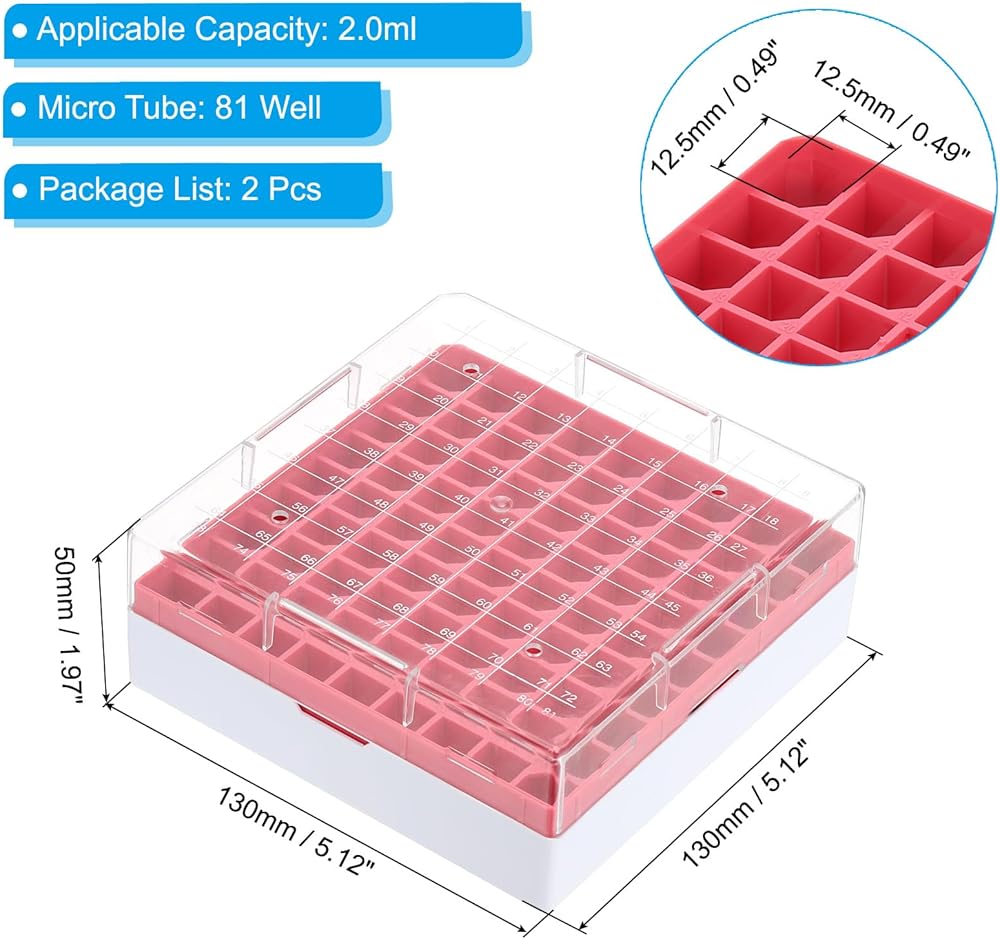 Specification: Material: Polycarbonate; Color: Yellow; Applicable Capacity: 2.0ml; Hole Size: 12.5 x 12.5mm / 0.49 x 0.49Inch (L*W); Overall Size: 130 x 130 x 50mm / 5.12 x 5.12 x 1.97Inch (L*W*H); Number of holes: 81 Well; Package List: 2 x Polycarbonate freezer box