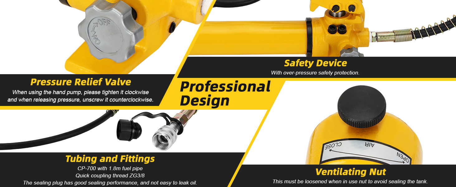 【Instruction for Using】Before using the powerful hydraulic hand pump, tighten the relief valve on it; and loosen the valve to release the pressure after using the CP-700 hydraulic pump. Before use, the bleeder nut must be loosened; after use, the nut must be tightened to avoid oil leakage. This hydraulic hand pump is easy to install and operate, and we have provided you with an instruction manual for reference