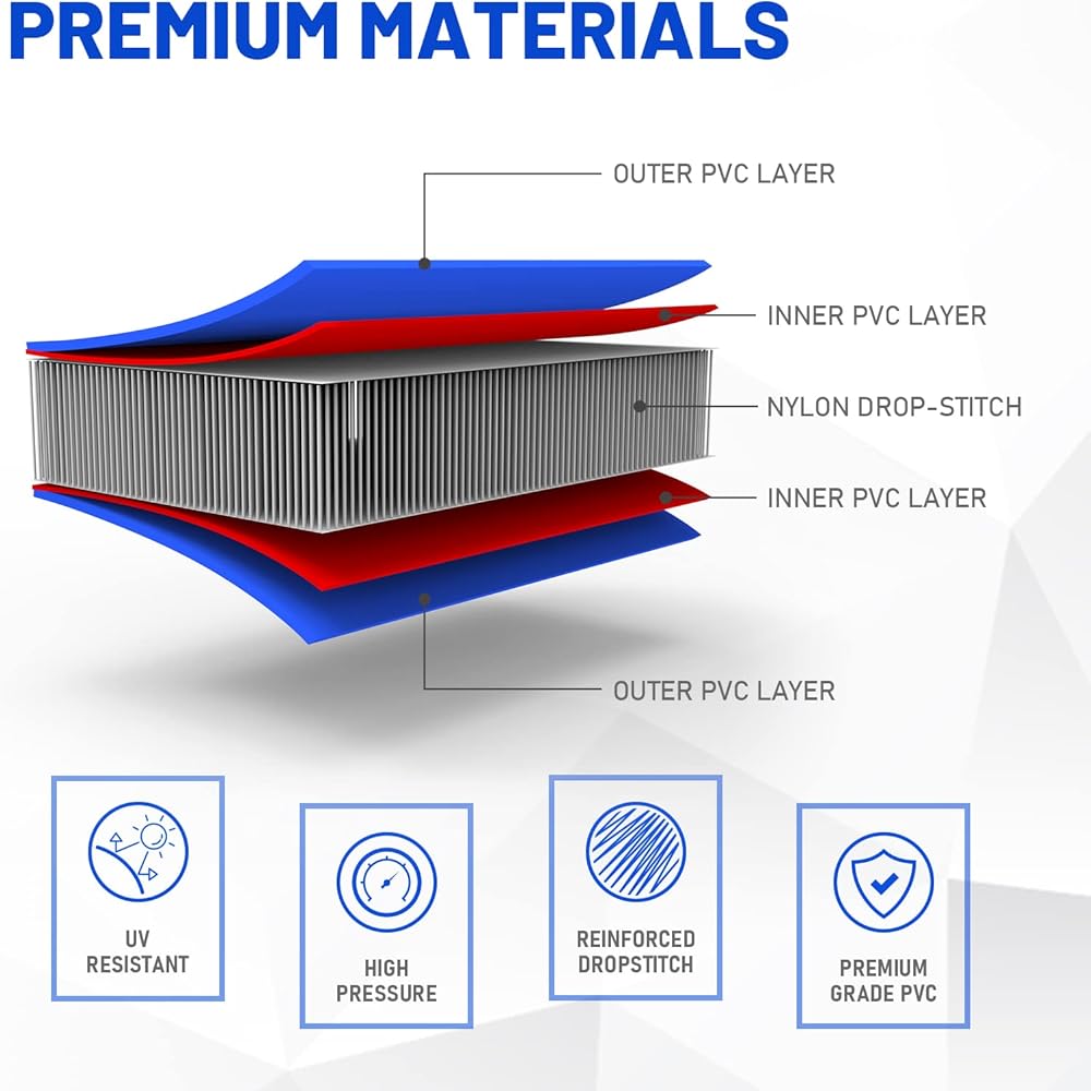 Premium training gym mat: The inflatable training mat is made of a double-layer PVC composite that retains its shape and stability even under pressure and impact.