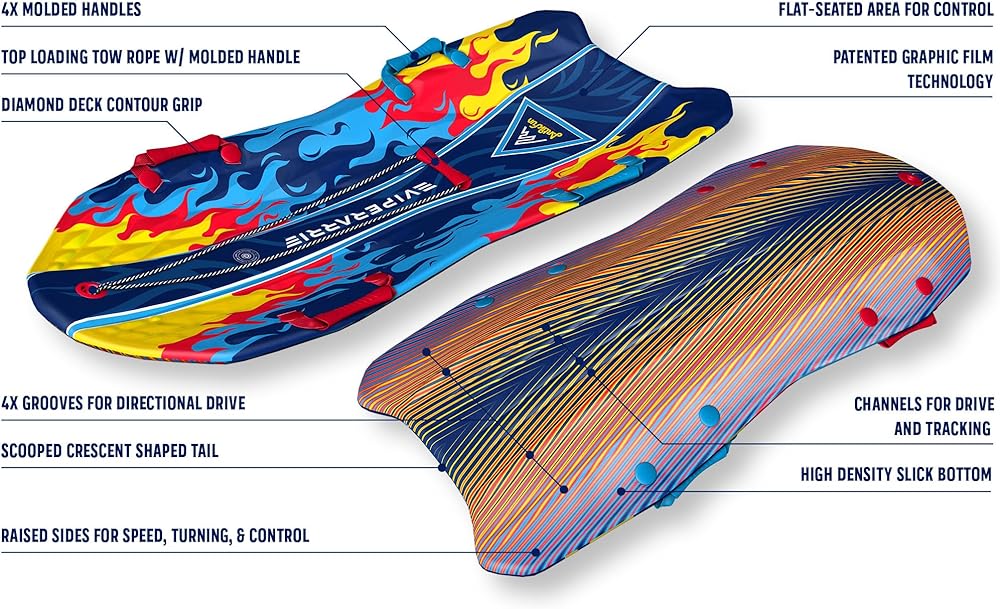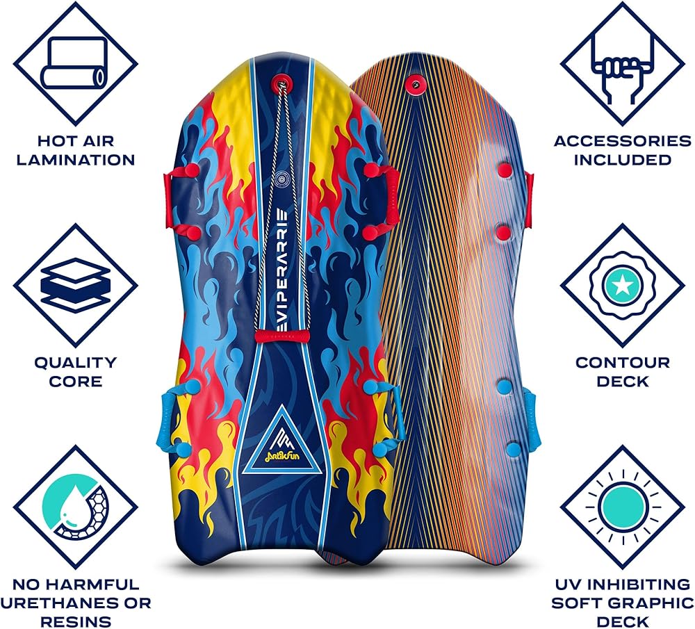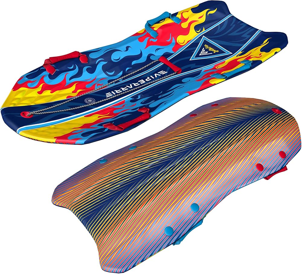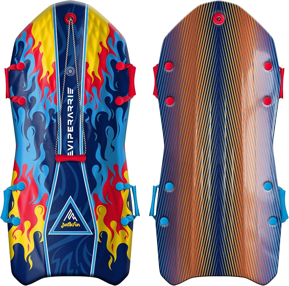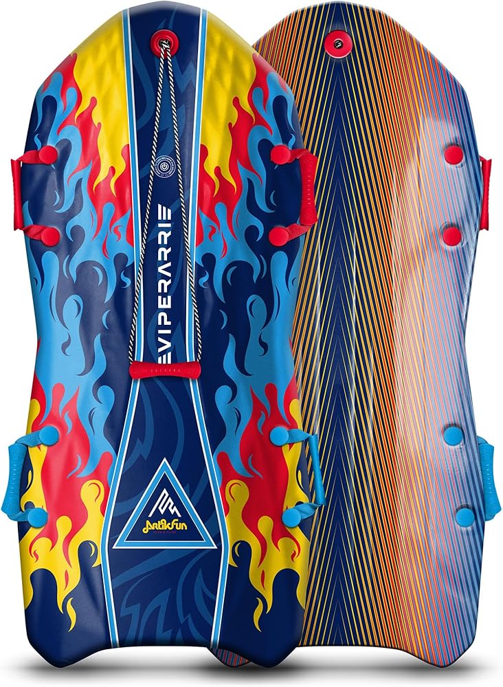 The Artikfun Viperarri Premium snow sled features a scooped deck that allows improved steering vs. hard plastic sleds or flat foam sleds. Slightly raised rails for easy grip and deck grooves improve grip to the sled. Ride sitting or laying down. Sized sled for one adult or youth. Smaller youths can fit up to two per sled, four handle design and generous width. Each snow sled features an exclusive contoured channel bottom for directional drive and speed and stiffness to maintain board shape.