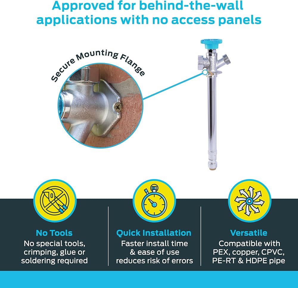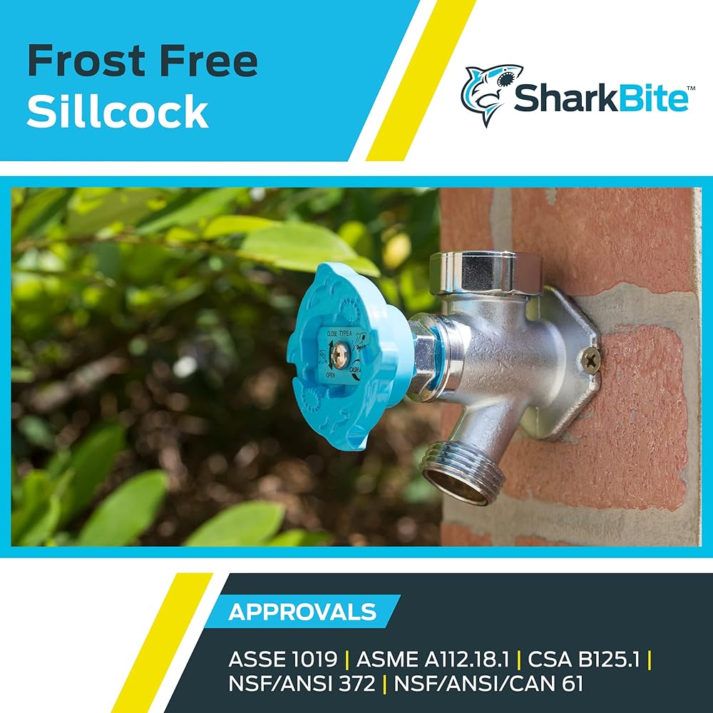Simplify your plumbing projects with the SharkBite brass push-to-connect frost-free sillcock. Ideal for working in tight spaces, the frost-free sillcock features an integrated vacuum breaker to prevent backflow and a mounting flange to secure the valve. The outside faucet valve of this sillcock features an integrated 1/2 inch push-fit inlet and 3/4 inch garden hose outlet, and a shut-off can be found at the inlet of the sillcock to drain the water and provide protection for the valve when freezing. These brass sillcocks work well with PEX, CPVC, PE-RT, SDR-9 HDPE, and copper pipes. The SharkBite brass frost-free sillcock features a push-to-connect mechanism for a watertight union, and allows for quick and easy installation, with no tools, crimping, glue, or soldering required, and can be installed in wet lines. Approved for behind-the-wall applications with no access panels, these plumbing sillcocks are suitable for freeze, emergency repairs, and home improvement projects. All SharkBite valves, clips, joints, and adapters are manufactured and tested in the USA.