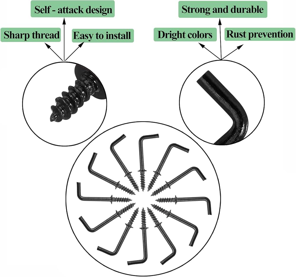 【L Shaped Design】: The black screw hook is right-angled, making it easy to attach to surfaces or hang items securely. Standard thread, using an automated electroplating machine to ensure that each screw is even plated and not easy to rust.