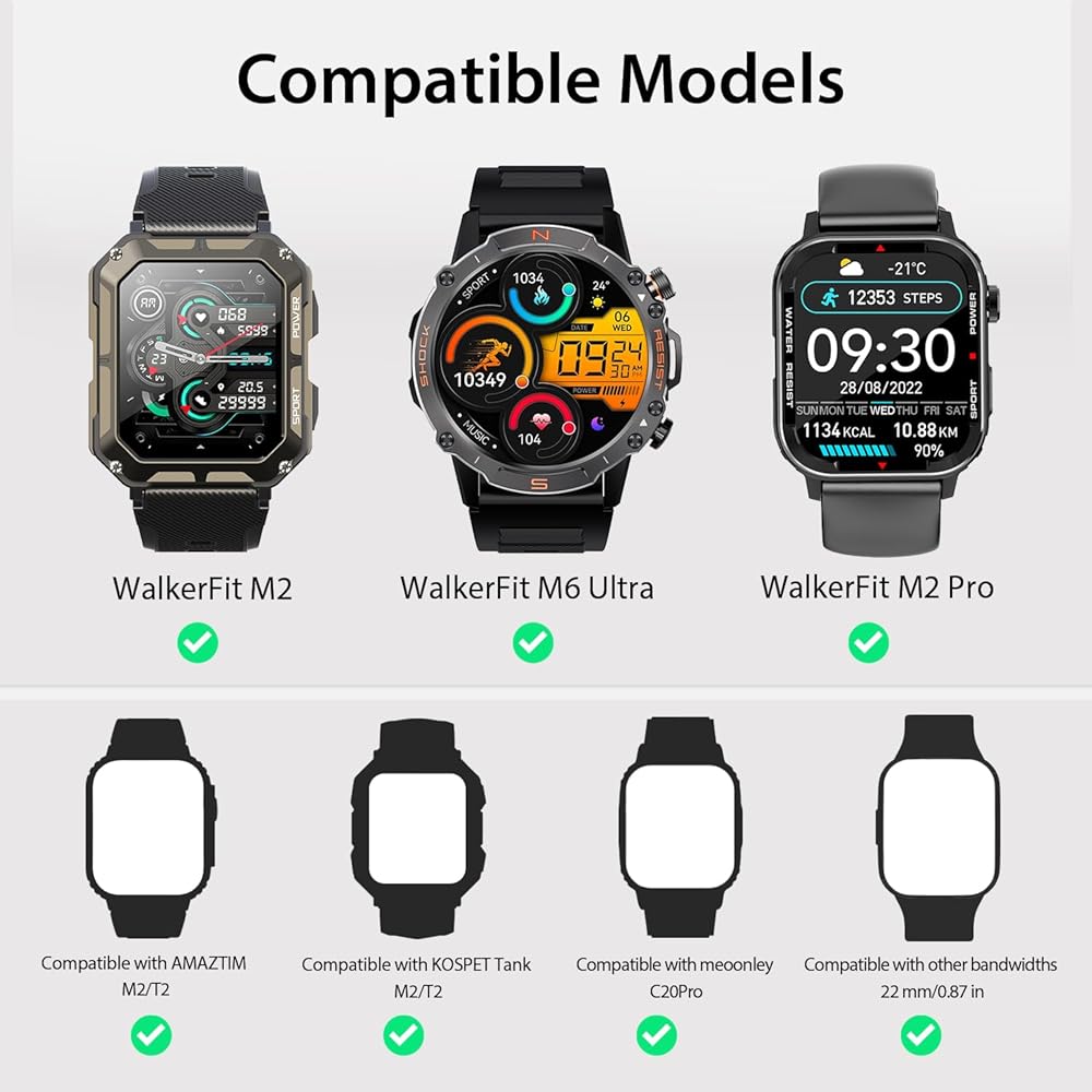 【Compatible Models】This TPU smart watch bands compatible with AMAZTIM M2/T2, compatible with SUNKTA K-52, compatible with FOXBOX K-52, compatible with KOSPET Tank M2/T2, compatible with PUREROYI C20Pro, compatible with WalkerFit M6 Ultra, compatible with meoonley C20Pro, compatible with Tensky C20Pro, compatible with HOFIT C20Pro, compatible with Rgthuhu C20Pro, and compatible with other smartwatches with a bandwidth of 22mm/0.87 inches. Note: Not compatible with 20 mm/0.78 in band width smartwa