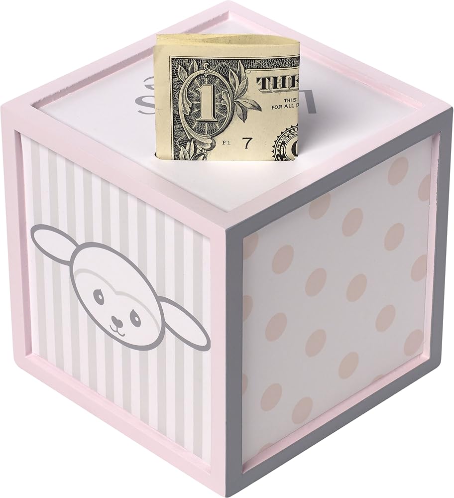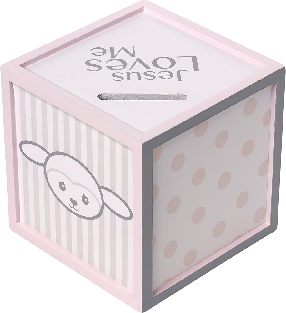Sharing an affirmation of Heavenly love, this white, pink, and Gray photo cube bank keeps all her first coins safe while showcasing a favorite photo