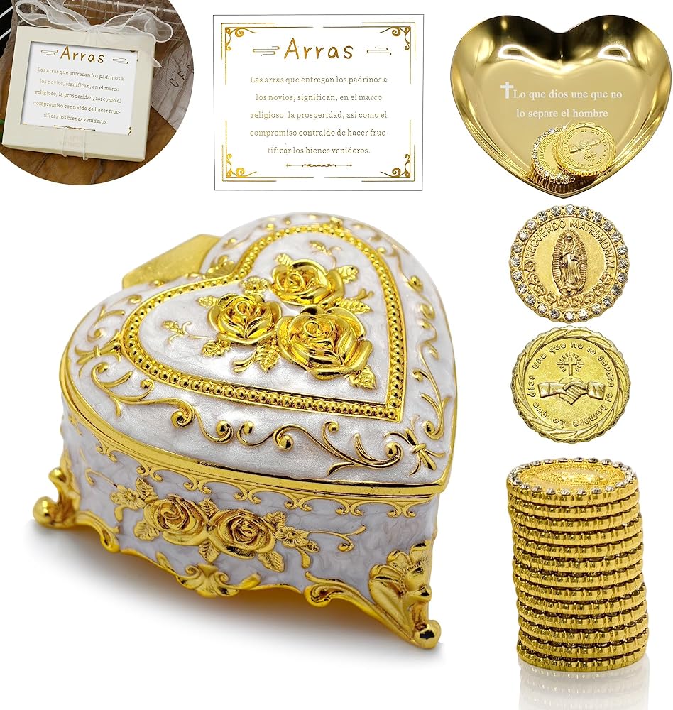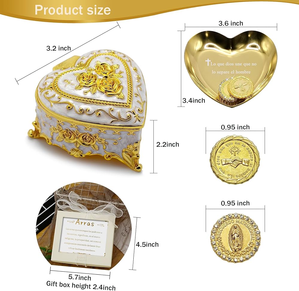 [Set Contents]: The set includes 13 gold-plated Guadalupe Virgin Mary coins adorned with diamonds, 1 coin box embellished with water diamonds, 1 gold heart-shaped decorative tray, and an exquisite box. It serves as a complement to any wedding ceremony, imparting its beautiful vision and blessings.